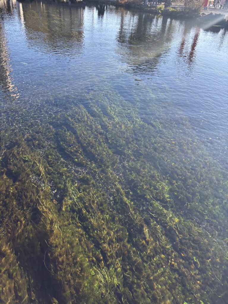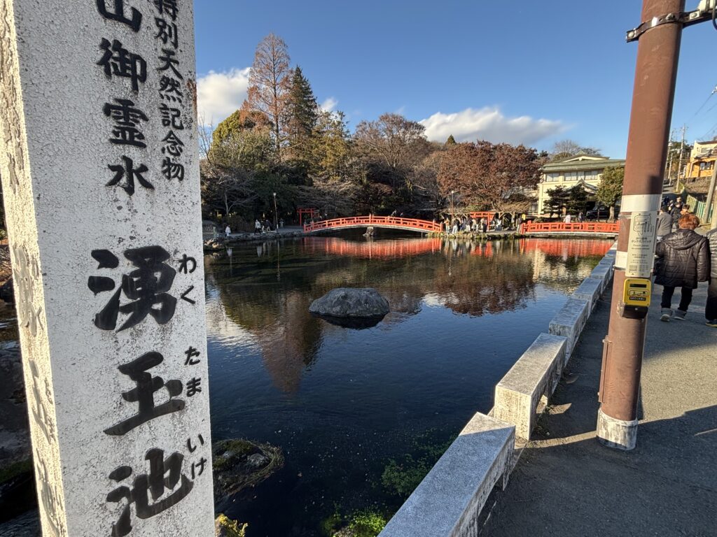 境内には、富士山の雪解け水が湧き出す「湧玉池(わくたまいけ)」があります。 特別天然記念物にも指定されているこの池の水は、驚くほど透明で、揺らめく水草がはっきりと見えました。