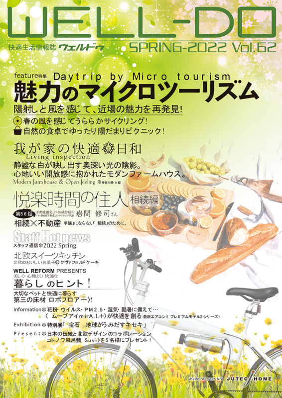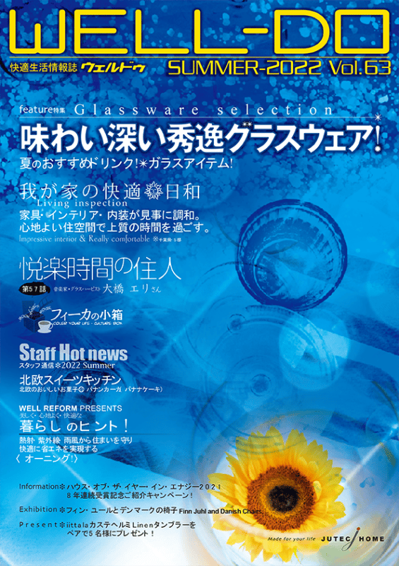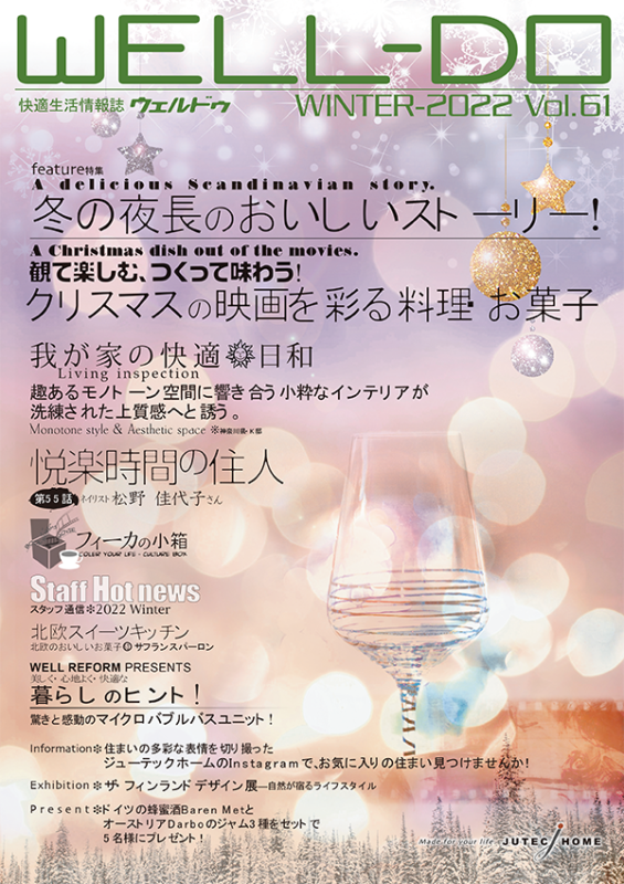 ジューテックホームがお届けする「WELL-DO」ウェルドゥは、住まいを通じてオーナー様と一生涯のお付き合いを育むための情報誌です。 北欧の暮らしに学ぶ快適なライフスタイルの提案や、住まいの性能を維持するためのメンテナンス方法、さらには季節ごとのイベント情報など、オーナー様の毎日をより豊かに、より安心に彩るコンテンツを定期的にお届けしています。