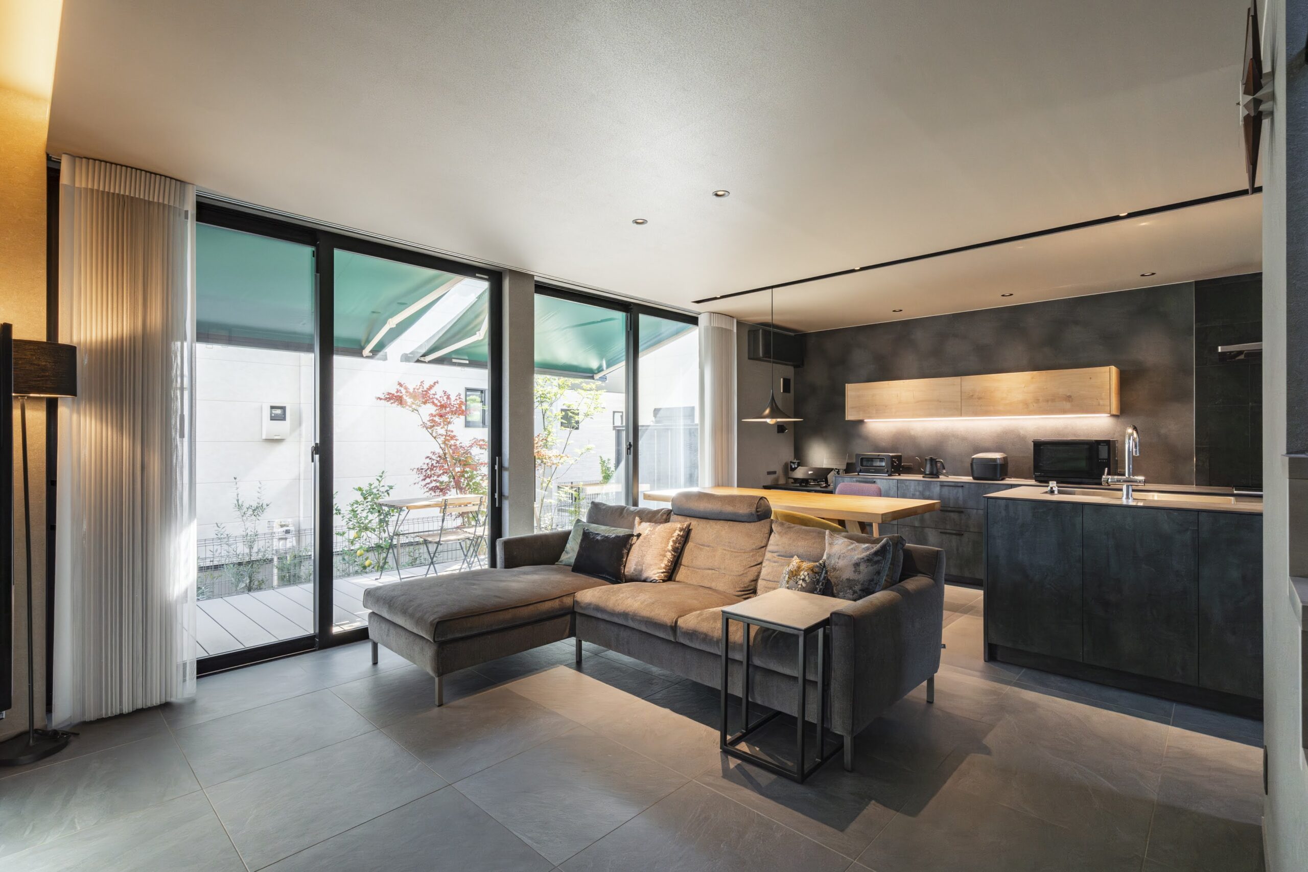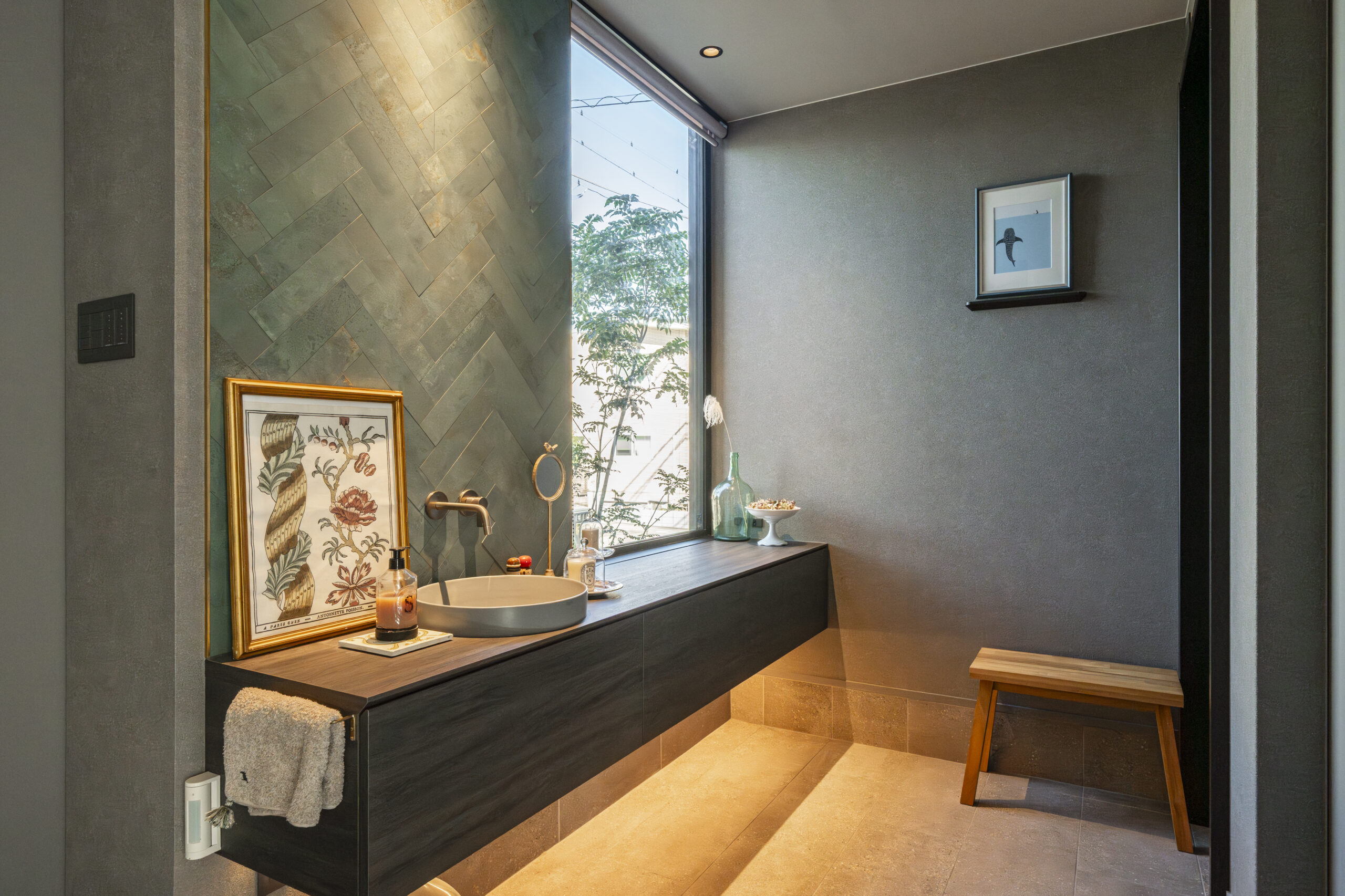 賃貸では難しかった「新しいチャレンジ」として、1階をダークカラーで統一。重厚感と洗練さが共存する空間やキッチンハウスのオーダーキッチンは必見です。