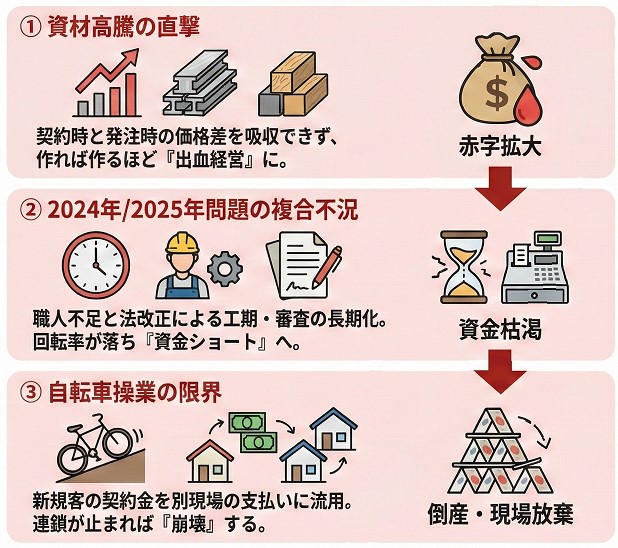 契約時と発注時の価格差を自社で吸収しきれず、作れば作るほど赤字になる「出血経営」。