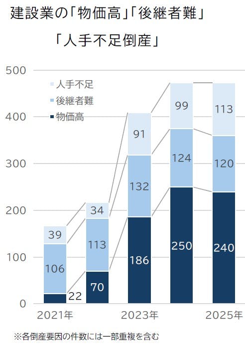 職人不足による工期遅延。4号特例縮小や省エネ適合性判定の義務化による確認申請の長期化により回転率が落ち、資金繰りがショートする。