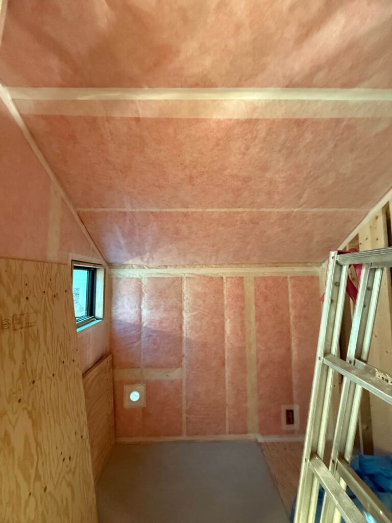 柱や間柱の間に、グラスウールがぴったりと隙間なく充填されています。特に写真のような斜めの天井部分は重力で下がりやすく施工が難しい場所ですが、熟練の職人がサイズを正確にカットし、断熱材を押し潰さないようフワッとした状態を保ったまま綺麗に収めています。