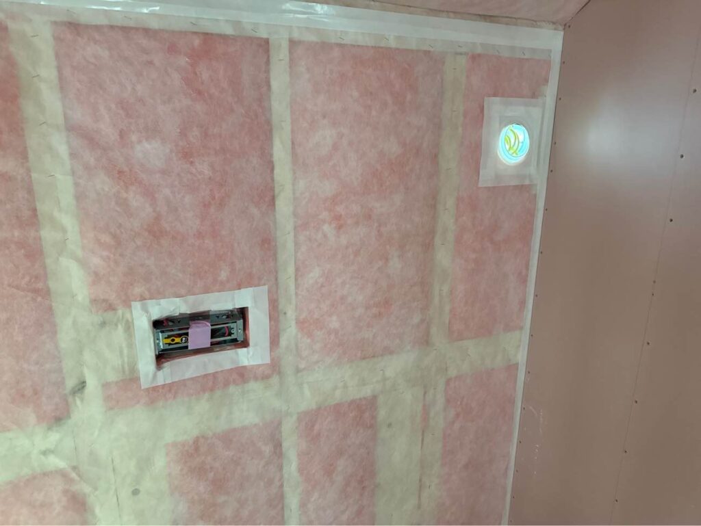 室内の湿気が壁の中に入るのを防ぐための重要なシートですが、ジューテックホームではこのシートをただ張るだけでなく、シートの継ぎ目や端の部分を専用の気密テープ(白いテープ部分)でしっかりと塞いでいます。
