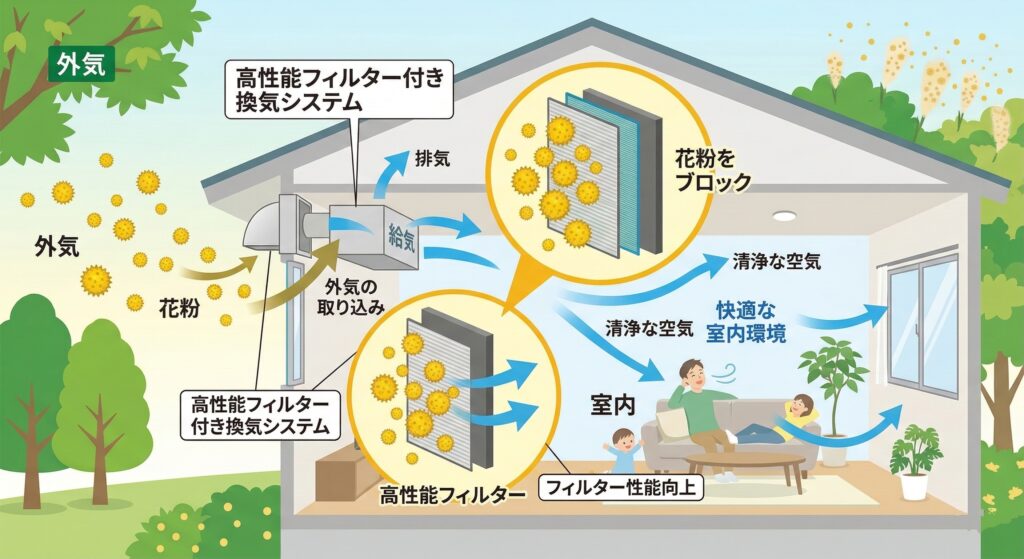| 花粉の侵入 | 隙間風と一緒に外から入り込む | 隙間がないので侵入をシャットアウト |