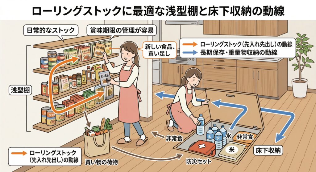| 飲料水(重い) | クローゼットの隅 | キッチンの床下収納 | 居住空間から消える。重い水を運ぶ負担が減る。 |