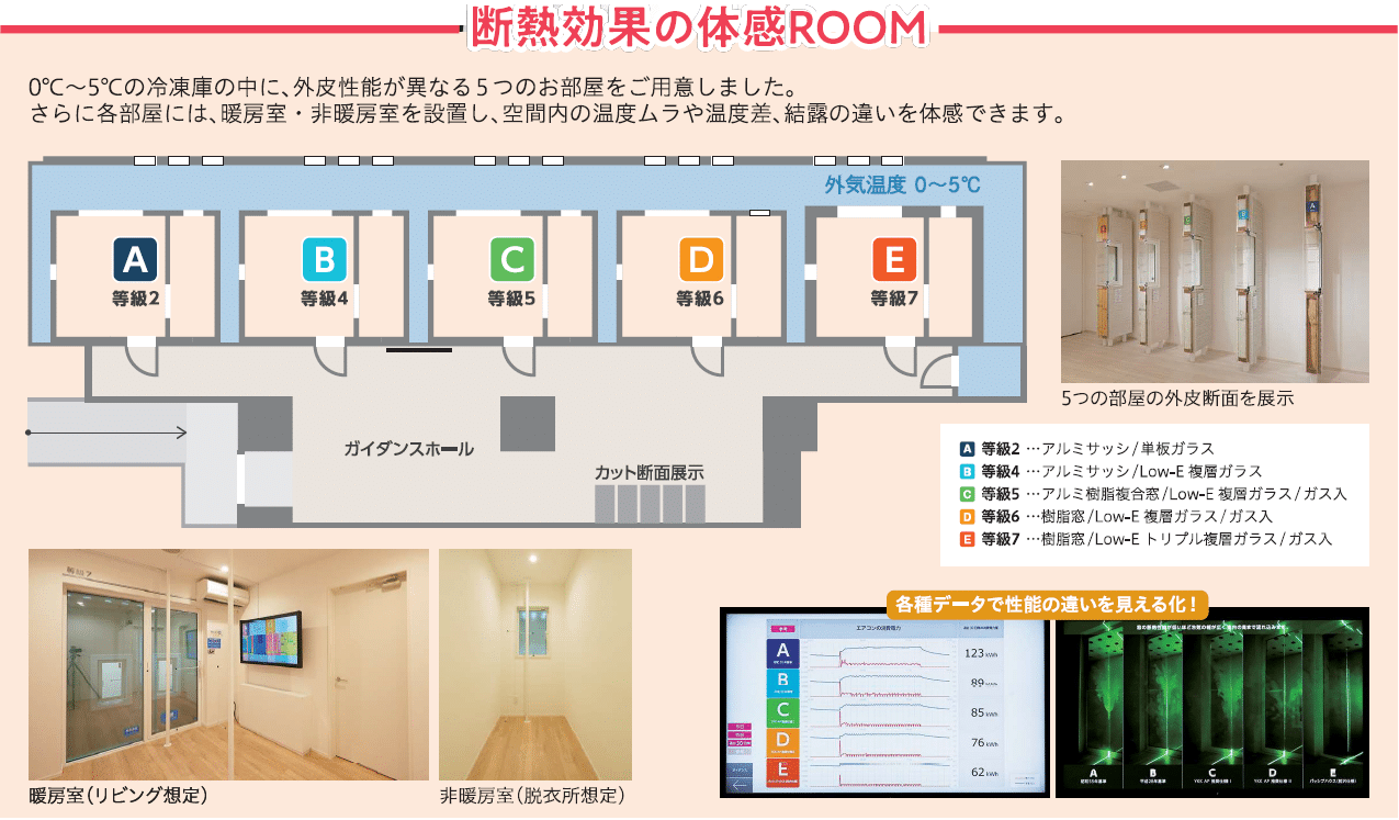 壁や天井や床などの断熱性能の違った5つの部屋を体感できます!