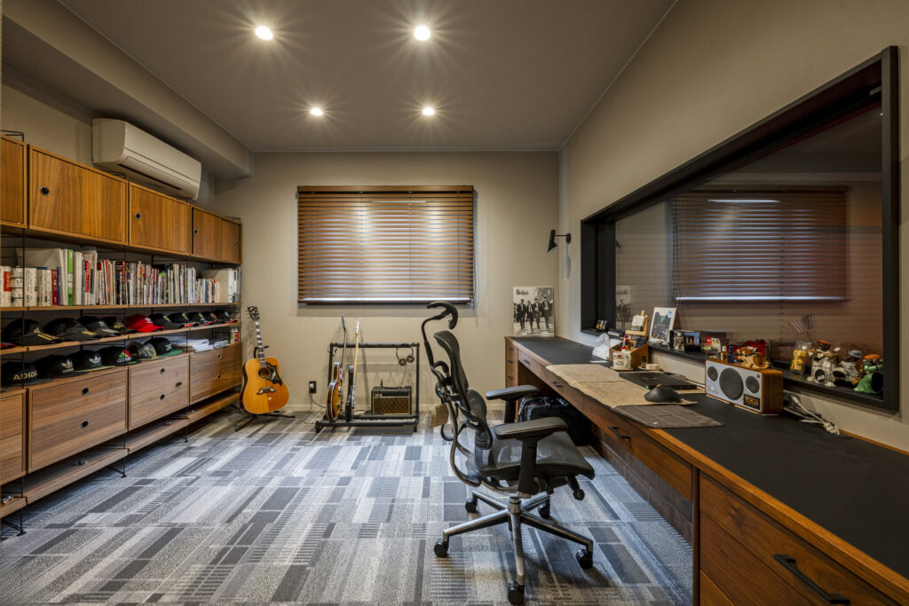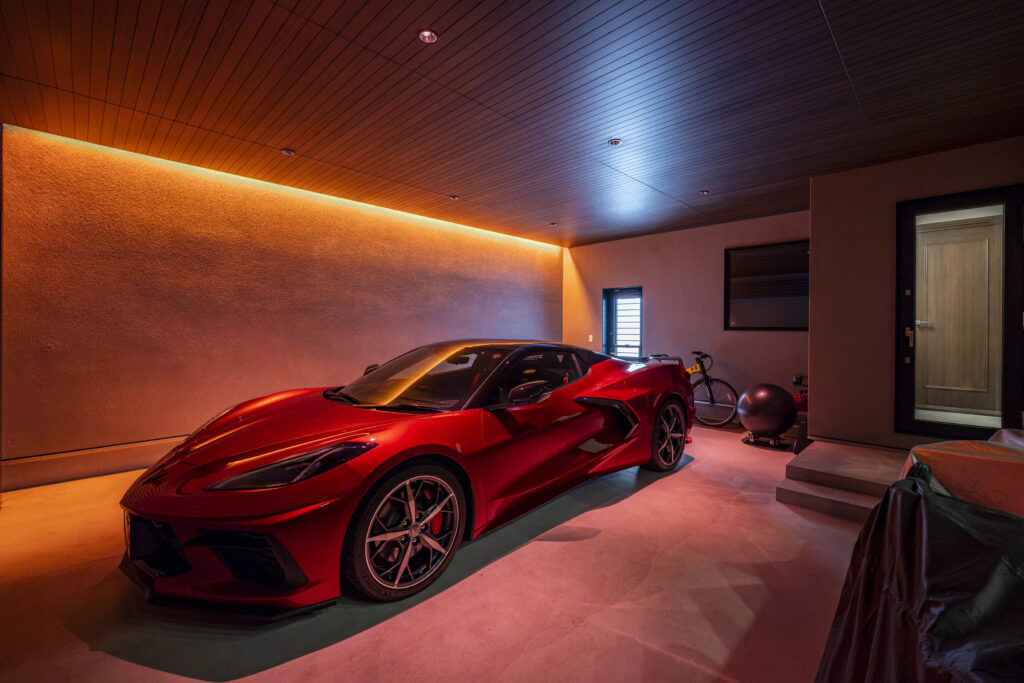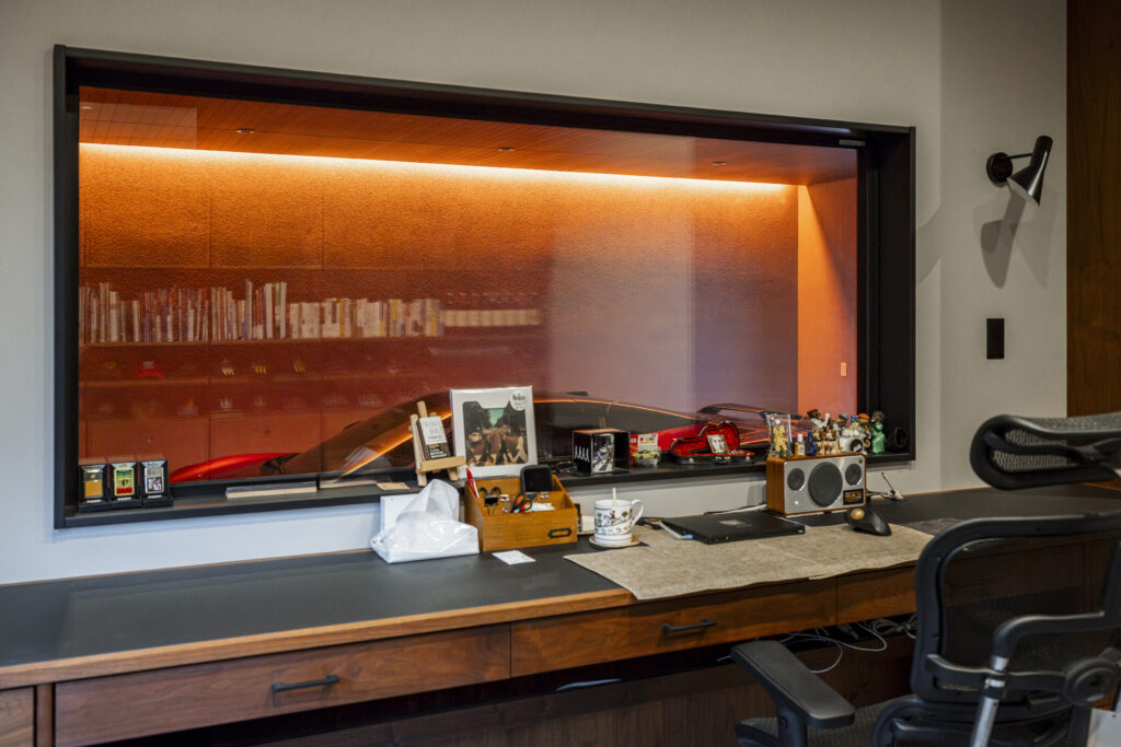 書斎には、自分のコレクションしたものを飾ったり、デスクの正面のガレージに面した窓から、お気に入りの車を眺めたりできるようになっています。ガレージに、自由に調光調色ができる次世代LEDの「Synca」を採用しているので、気分や車のボディのカラーに合わせて、ライティングを自在に変えられるのもいいですね。週に半分ぐらいは、都内のオフィスには行かずに、この書斎で仕事をしています。
