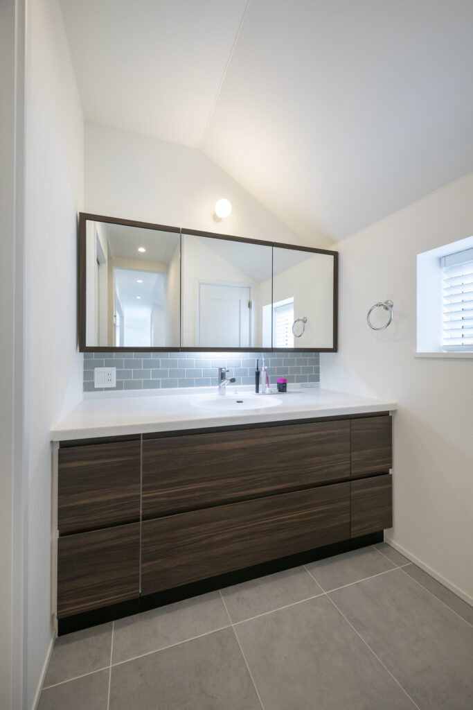 洗面も、右と左で2人並んでそれぞれが使えるように左右を長めに作ってもらったので、朝の身支度でぶつかることがなくなり、快適になりました。
