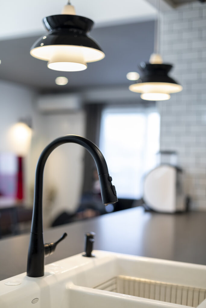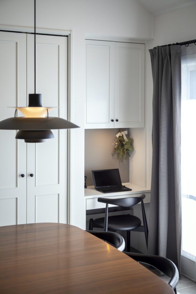 中に入れるものを細かく決めてFILEさんと共に設計してもらったたので、物がぴったり収まり、とても使い勝手がよくできています。あとはもちろん、FILE製のキッチンやインテリア。照明や小物もテイストを合わせて楽しんでいます。