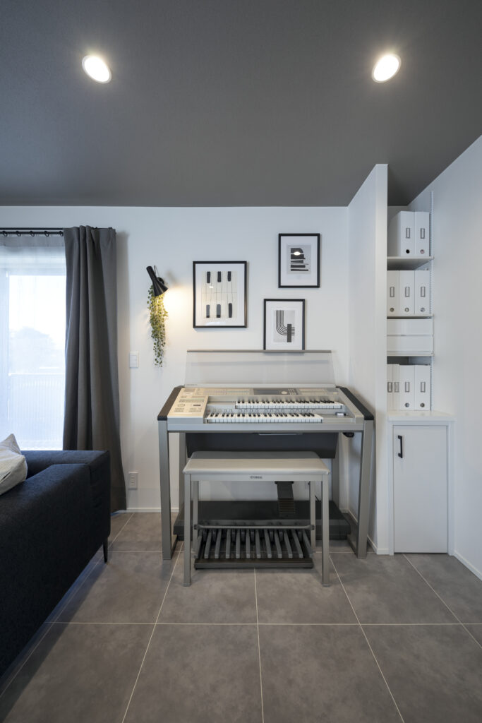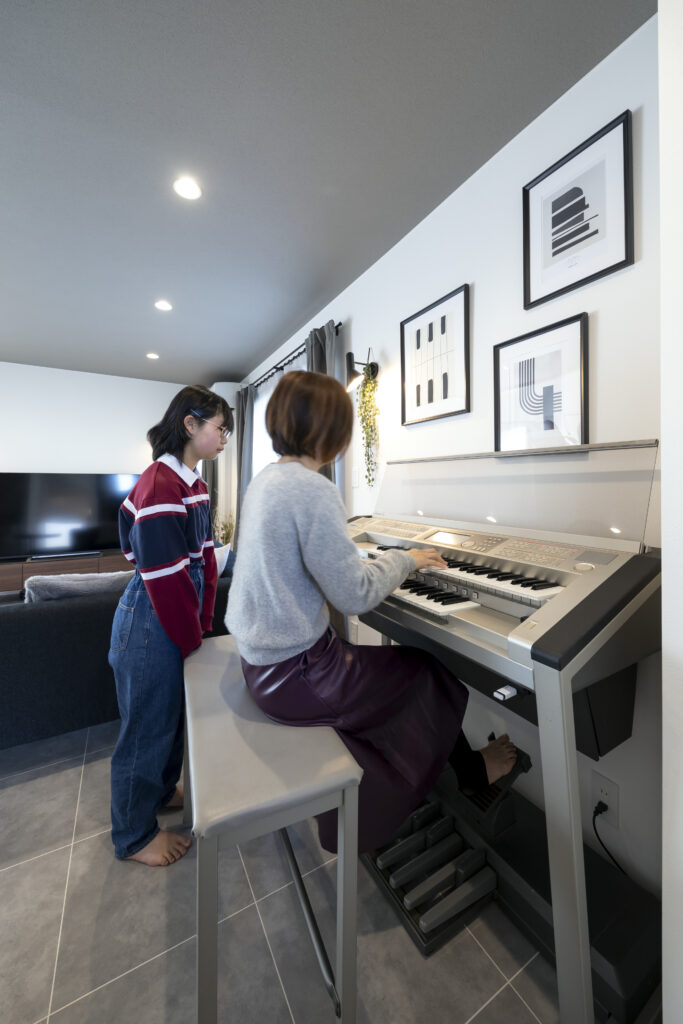 妻と娘が趣味でエレクトーンを弾くため、音漏れを心配していましたが、気密性・遮音性が高いことで特別な防音工事をしていなくても外への音漏れもなく、安心して楽しめています。エレクトーンはリビングに置いているのですが、木目をマスキングテープでアレンジして、インテリアのトーンに合わせてみました。