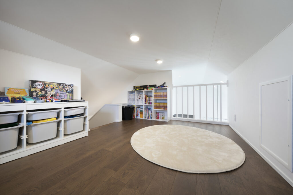 子どもたちのお気に入りは小屋裏収納。ここからリビングを見ることもでき、第2のリビング兼…子ども部屋として使っています。