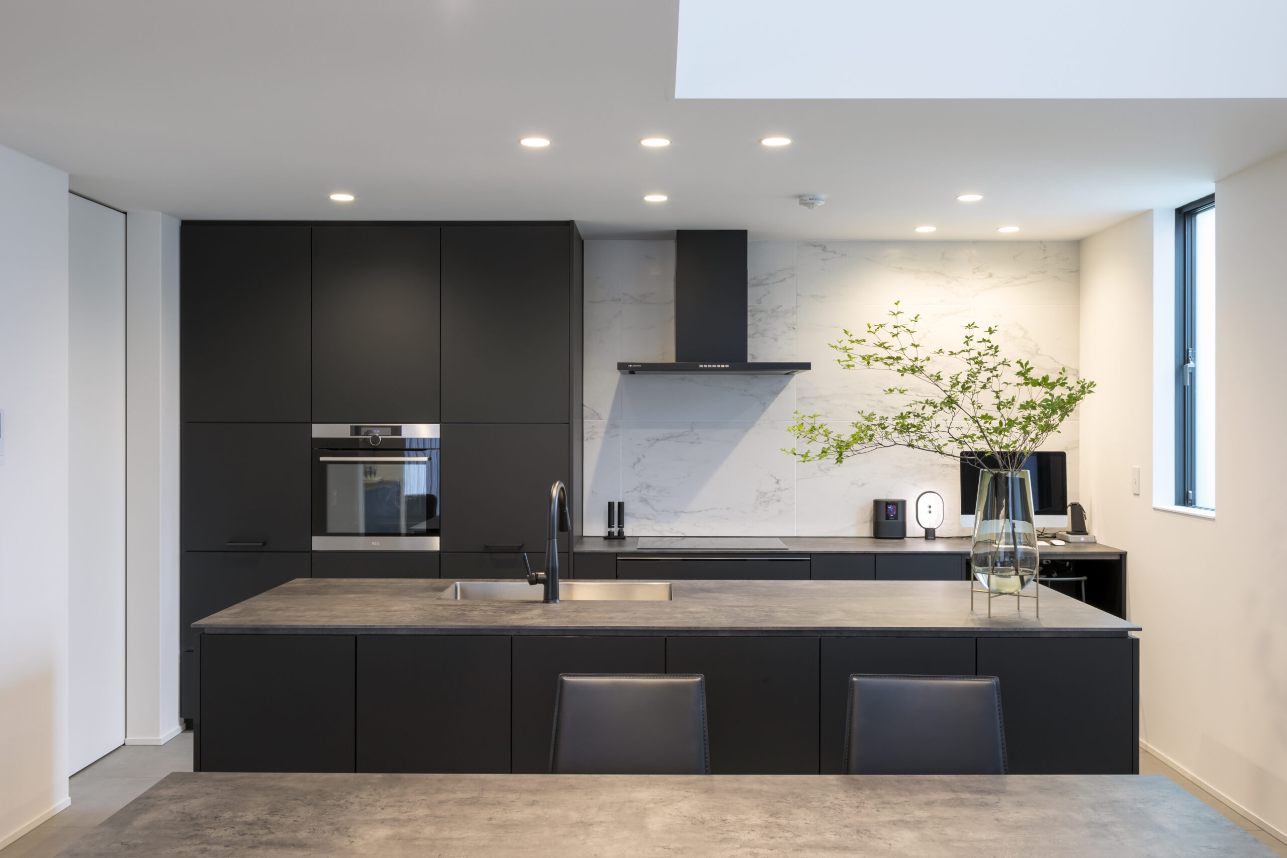 キッチンを主役に、ここを中心にして1階をデザインしています。夫婦ともにモノトーンのシンプルなデザインテイストが好みなので、質感や色味を合わせるよう全部をコーディネートして、キッチンのデザインに合わせたモノトーンに統一できたのが嬉しいですね。