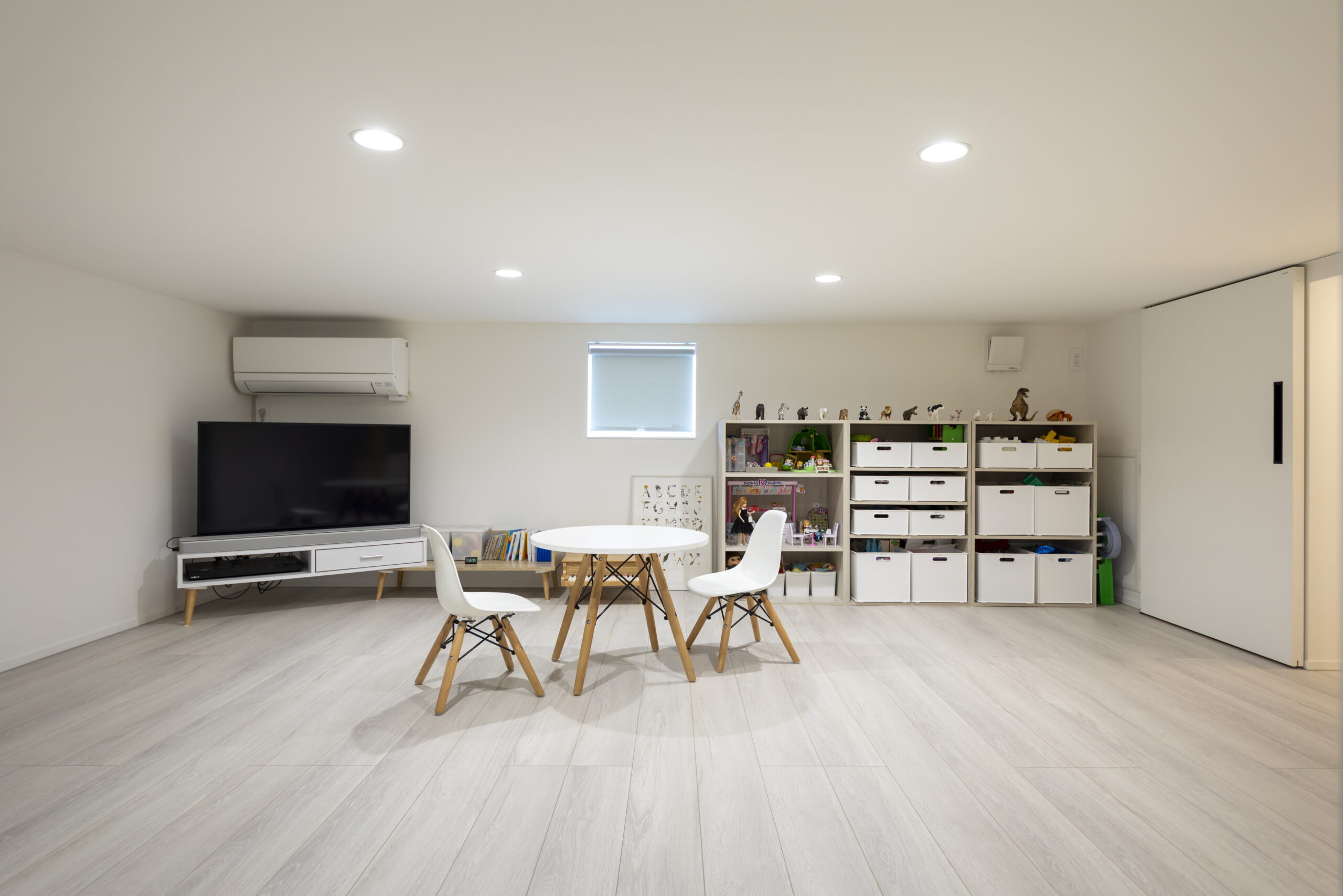 将来は物置として使用する予定ですが、それまでは小さい子どもたちのプレイルームとして利用するため、広々とした設計にしました。どれだけ散らかしても大人の生活空間からは視界に入らず、ストレスも軽減しました。階段から子どもたちの声が聞こえてくるので、いつも気配を感じていられます。