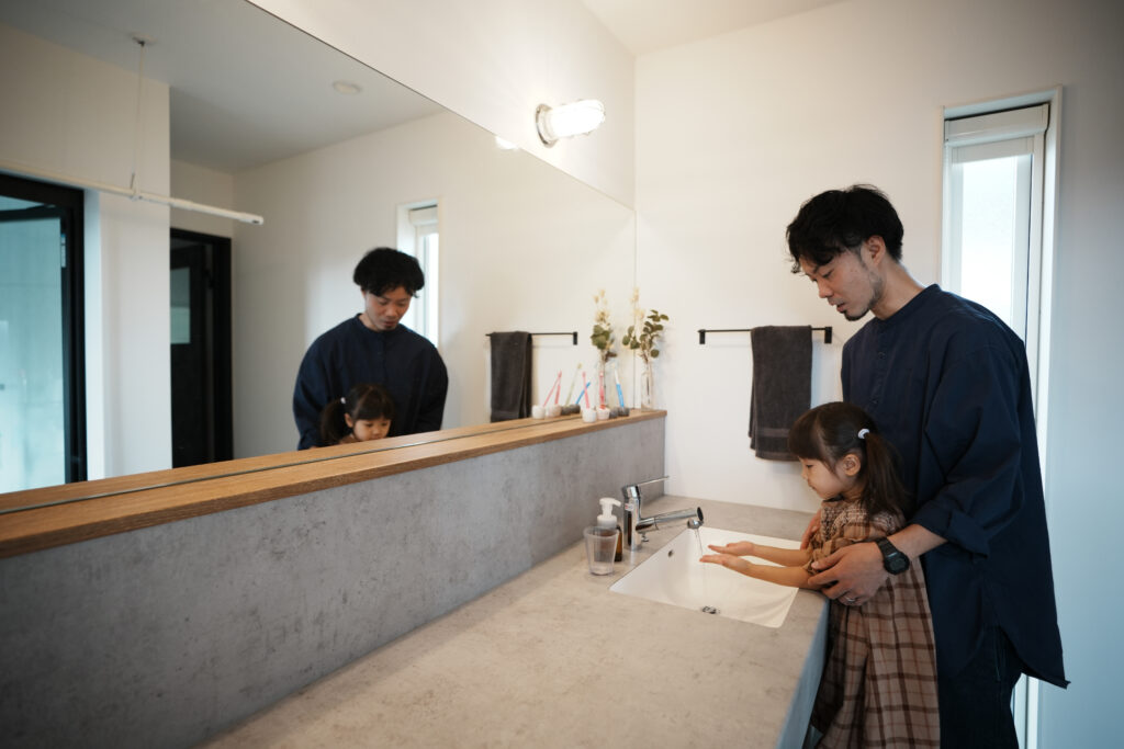 あとは、特に2Fの造作で作ってもらった洗面のデザイン。自分がデザインの仕事をしているので、内装にはこだわりがあって。床を磁器タイル張りにして、裸になるエリアなのでその部分にも蓄熱式温水床暖房をつけたのも気に入っているポイントです。