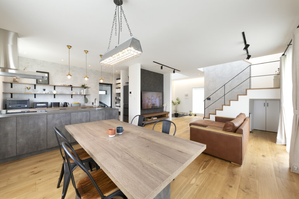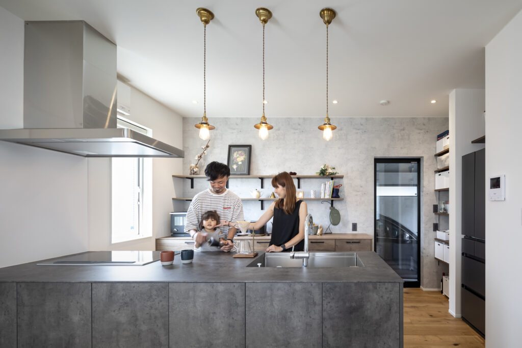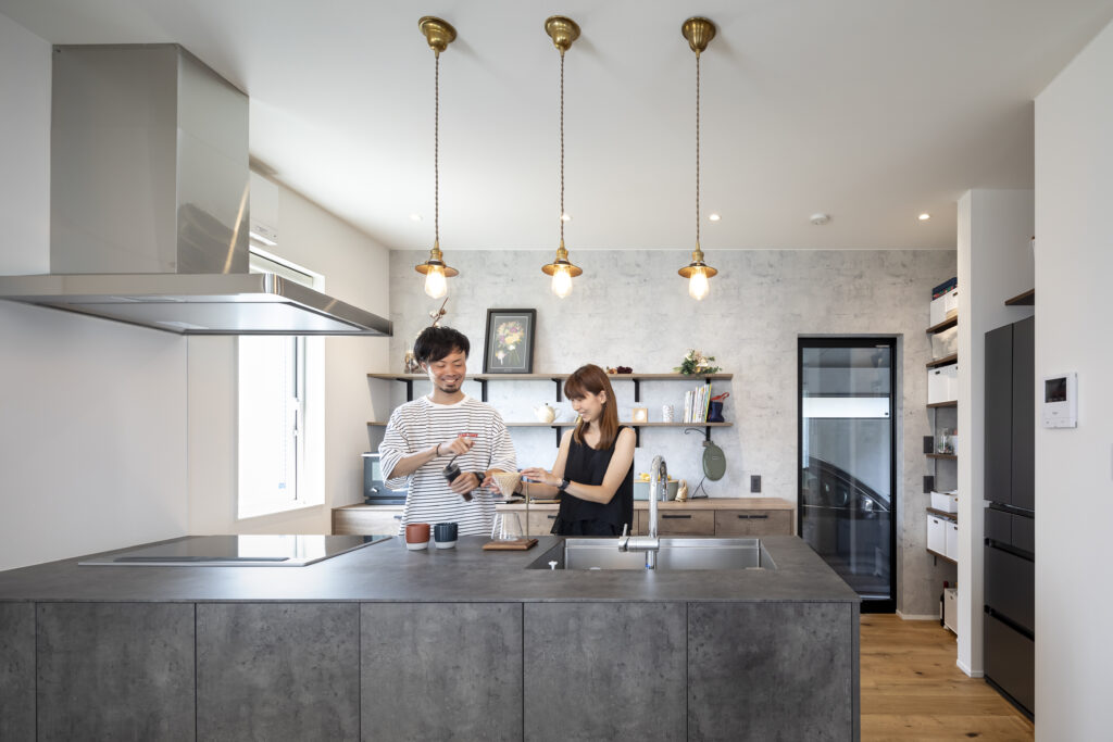 自分たちの希望は、ジューテックホームではあまりみたことのない、NYスタイルのデザイン。たとえば、黒のアイアンやダークブラウンのウッドづかい、コンクリート打ちっぱなし風の壁紙など。照明、家具も同じテイストで揃えています。キッチンとダイニングの印象的なペンダントライトは、自分で探したものを取り付けてもらいました。キッチンのデザインは、画像検索で見つけて一目惚れしたキッチンハウスのもの。担当さんと一緒に、新宿のお店を別の目的で見に行ったタイミングで、ネットでみたのと全く同じキッチンがたまたま展示されていて、その場で即決してしまいました。