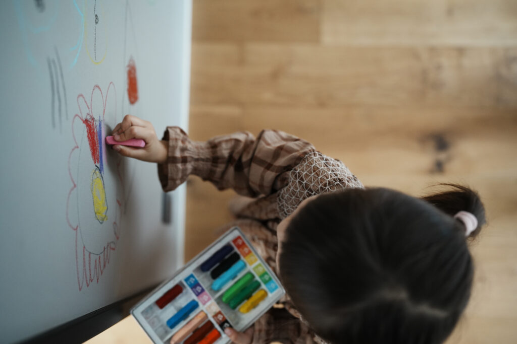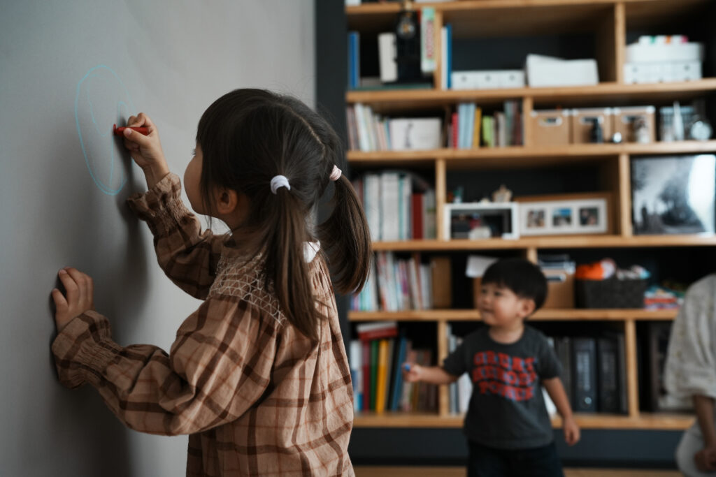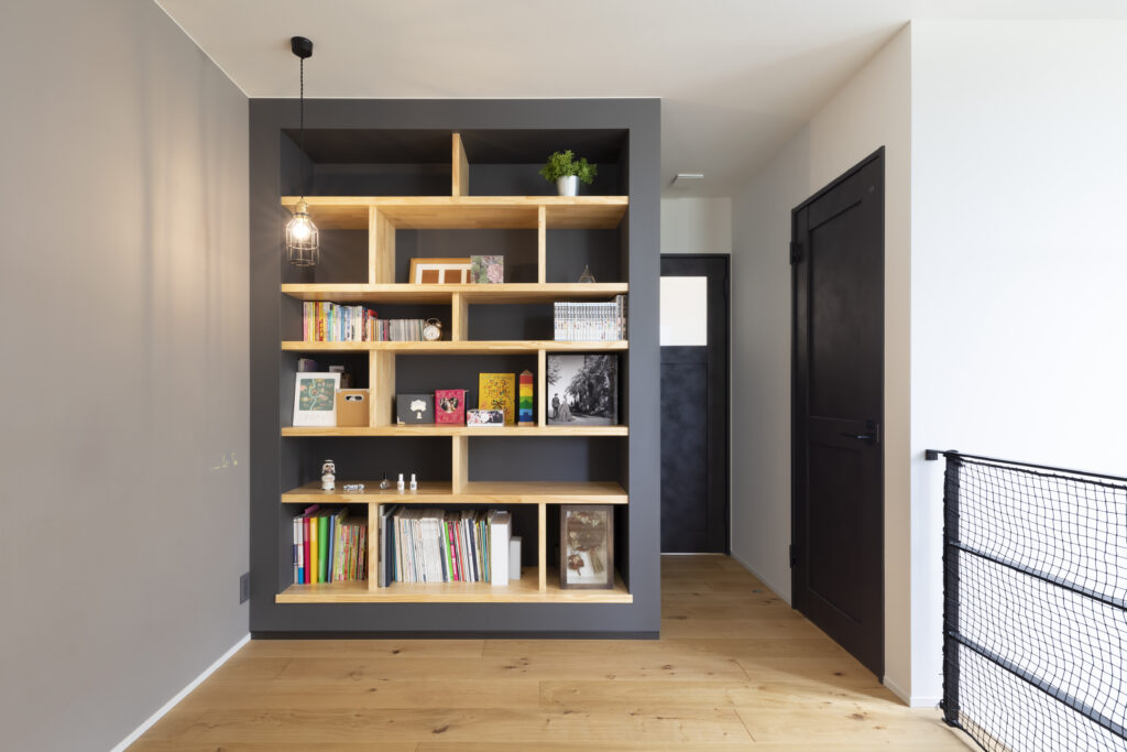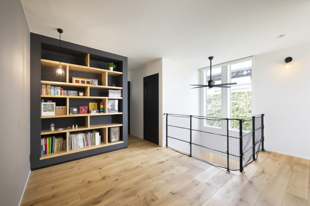 2Fの中央は造作のおしゃれな書棚と、マグネットやチョークが使えるウォールのあるフリースペースにしました。一階部分とも吹き抜けで繋がっています。特にこれという目的がないから、本を読むとか、子どもと遊ぶとか、オンラインで仕事とか、何でも自由に使えるところがいいなと思っています。