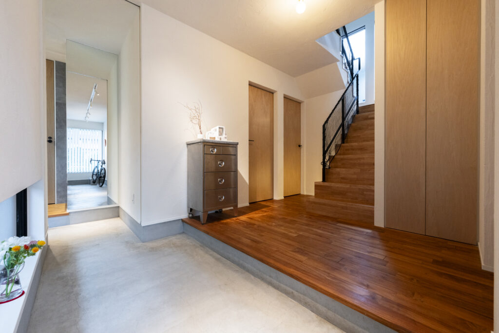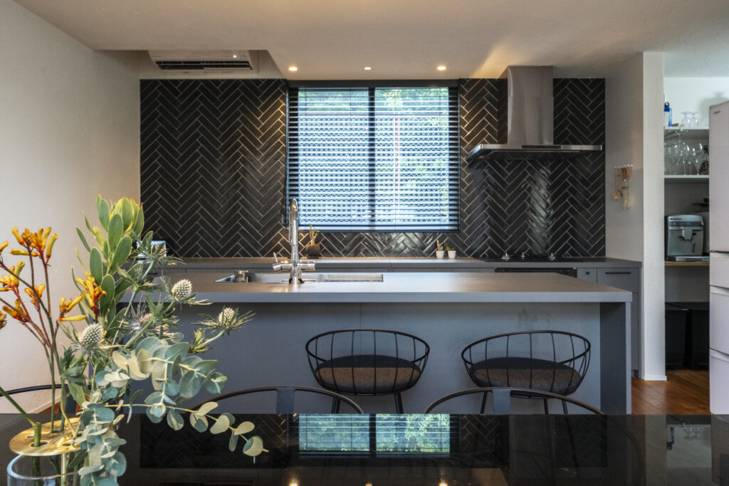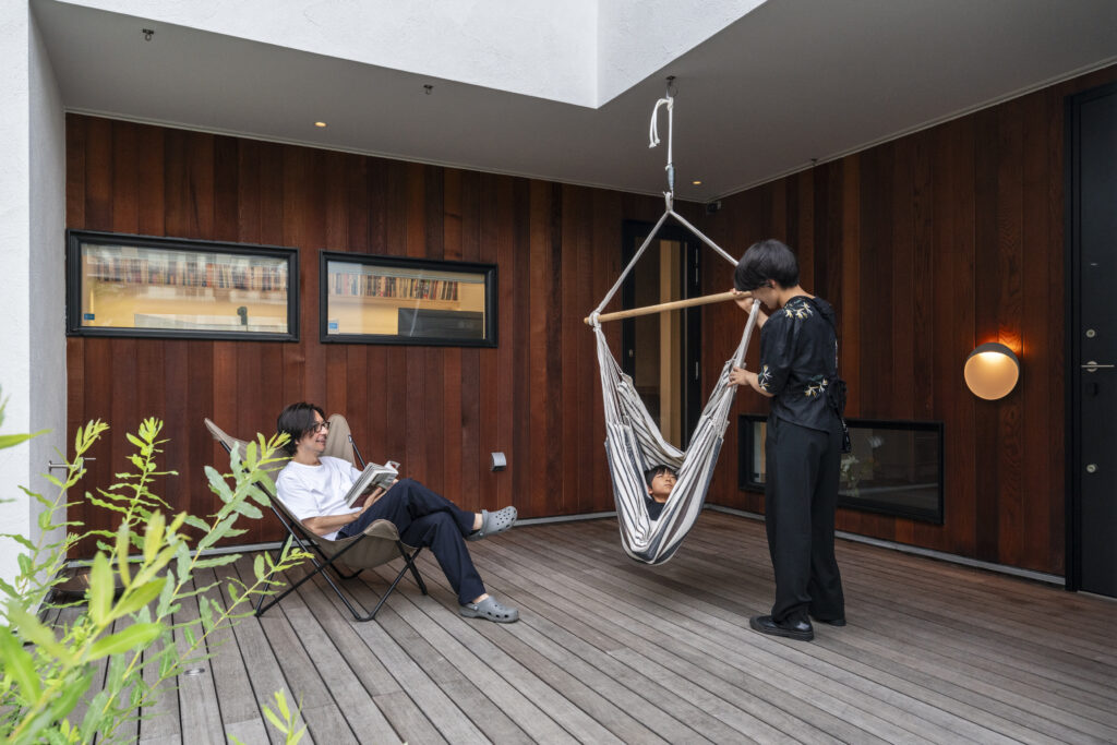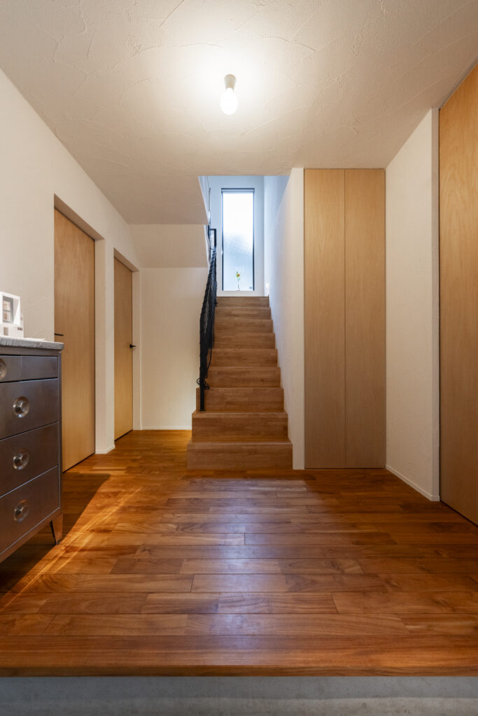 家の中で自然光の家族写真を撮りたくて、「光の美しい家」を設計テーマの一つにして頂きました。幸い前が公園、後ろが学校という恵まれた立地のため、 2階リビングでカーテンを開けても視線が気になりません。おかげで大きな窓から常に自然光が差し込む美しい空間が完成しました。