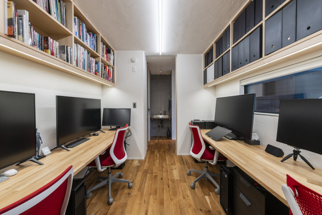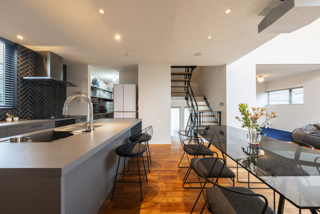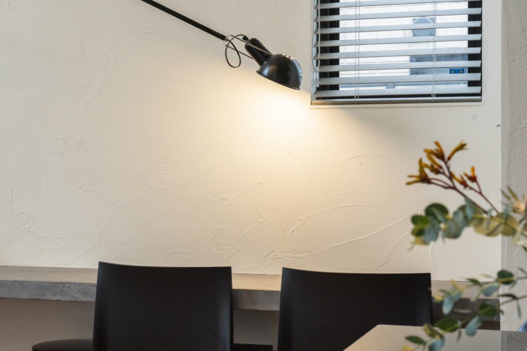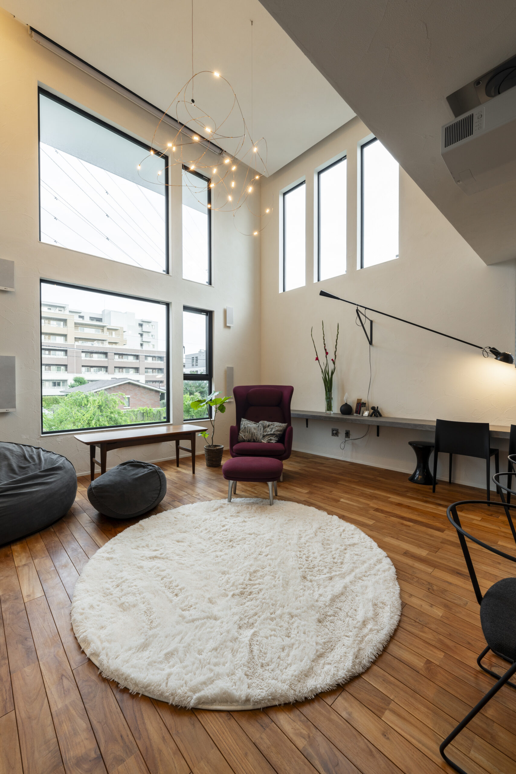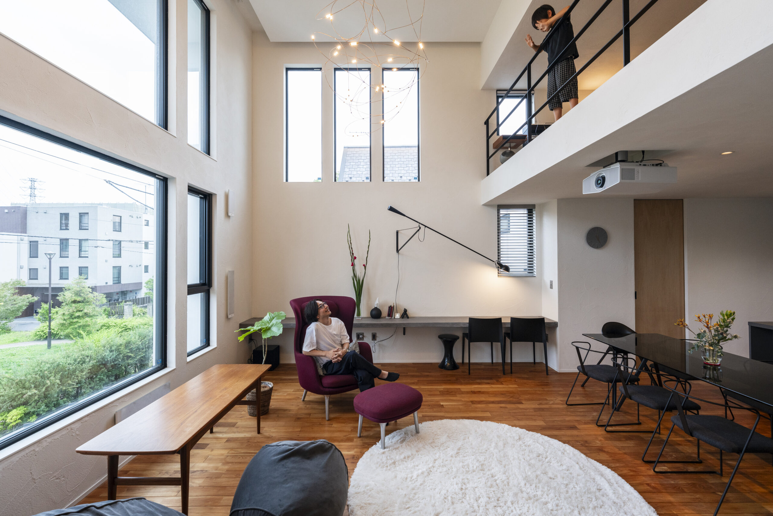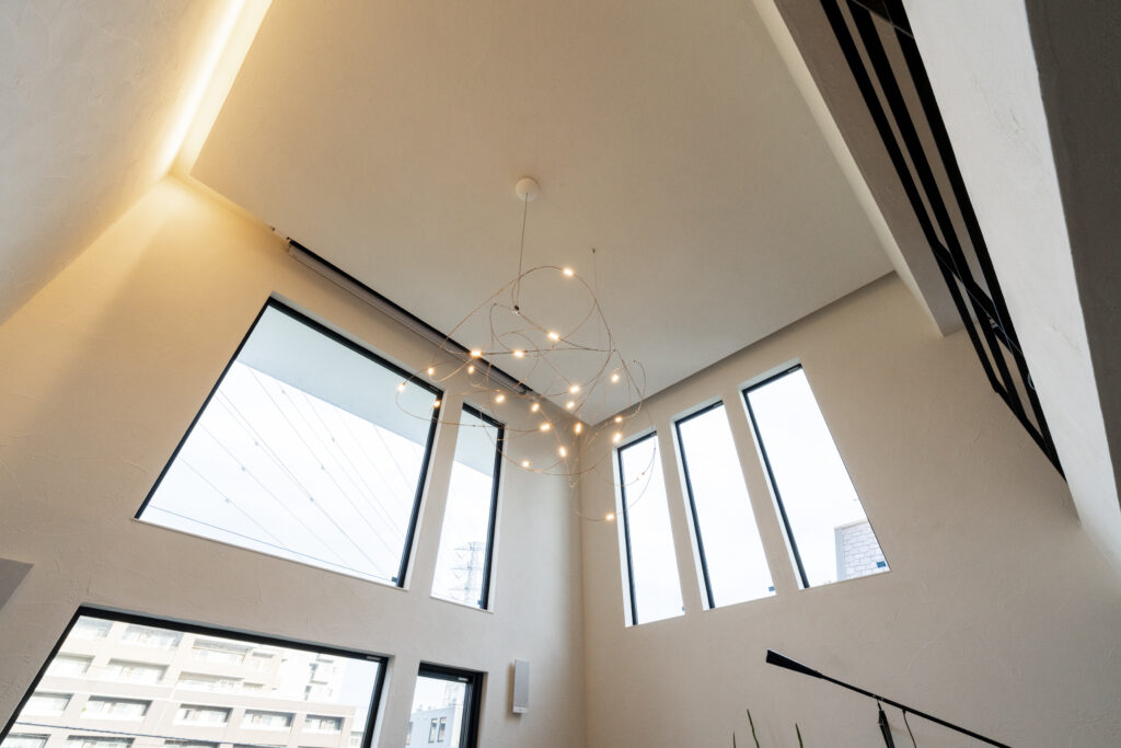 日が沈んでからの光にもこだわり、リビングの吹き抜けには現代彫刻のような照明 (flock of light / moooi)を吊り下げ、モダンな内装と相まって美術館のような雰囲気に仕上げています。