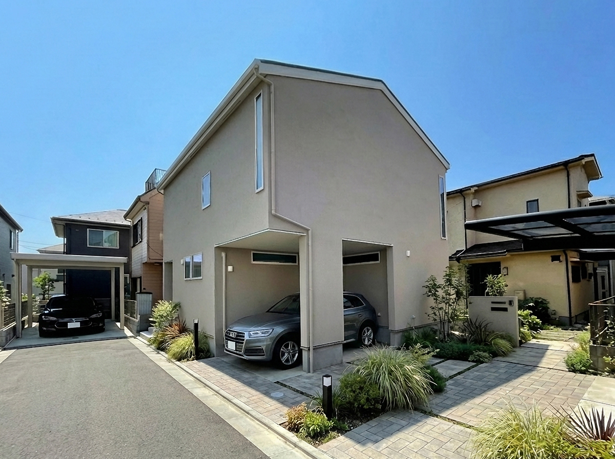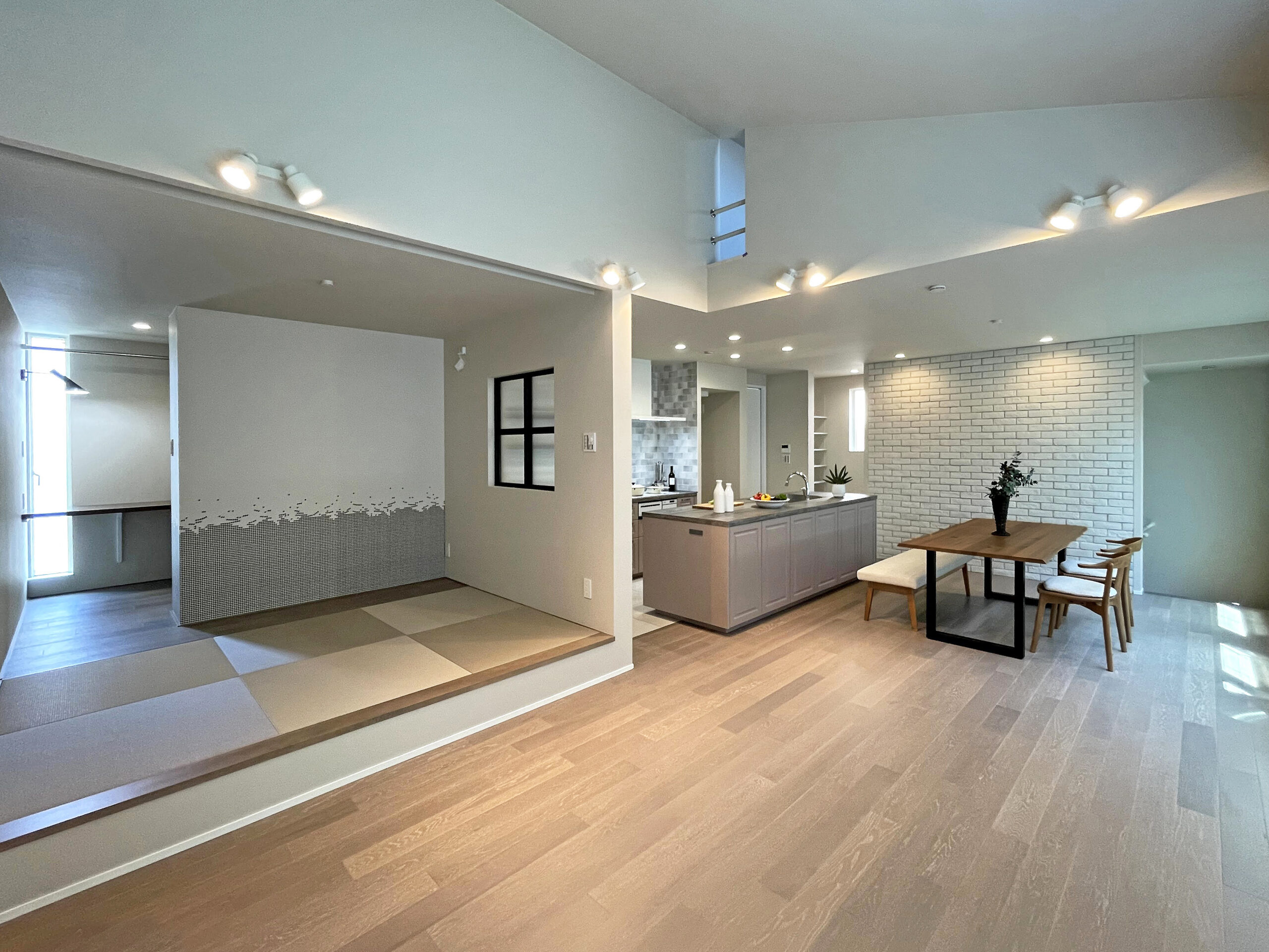 吹き抜けとヘリンボーン床が美しい、光溢れる開放的なリビングの住まい