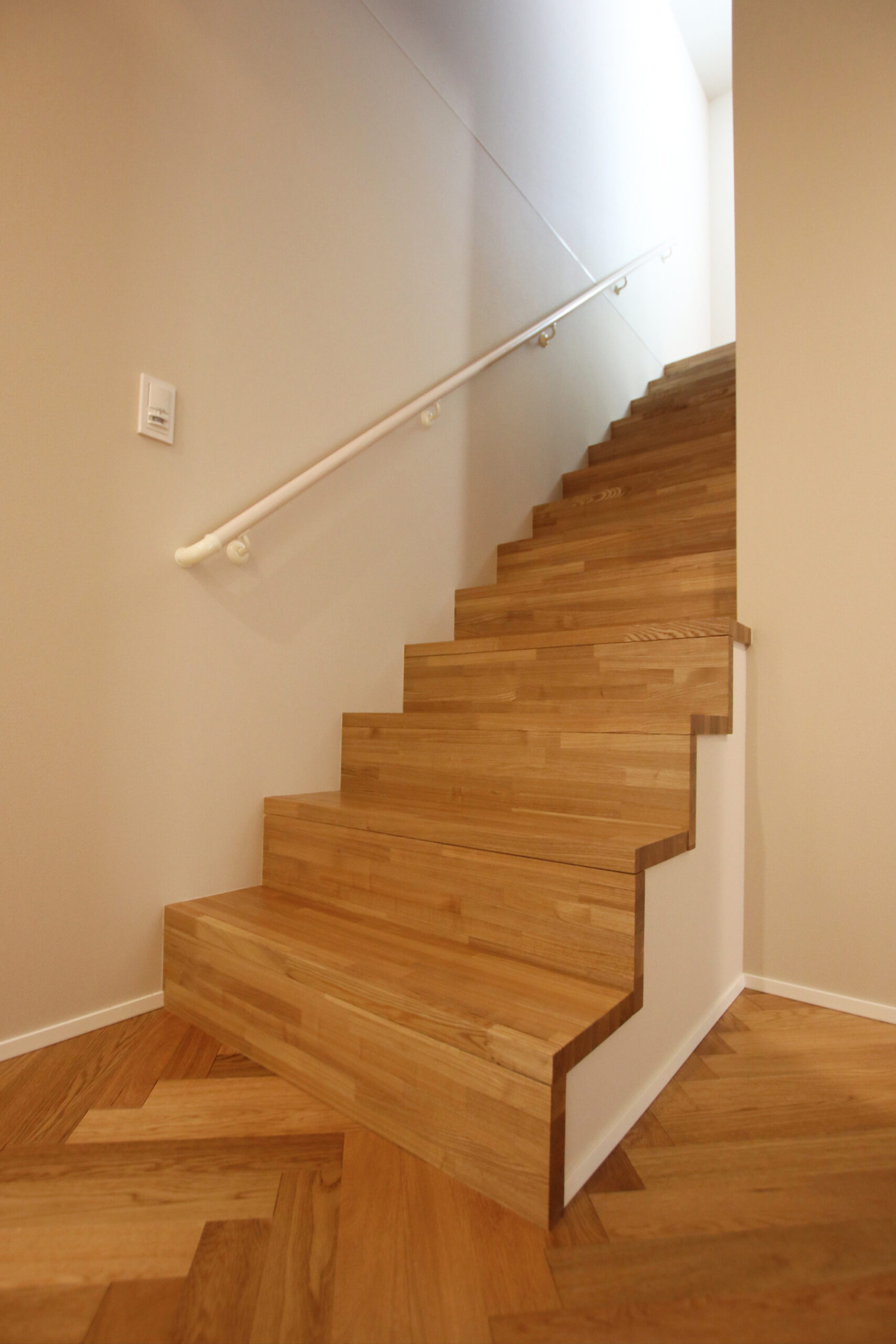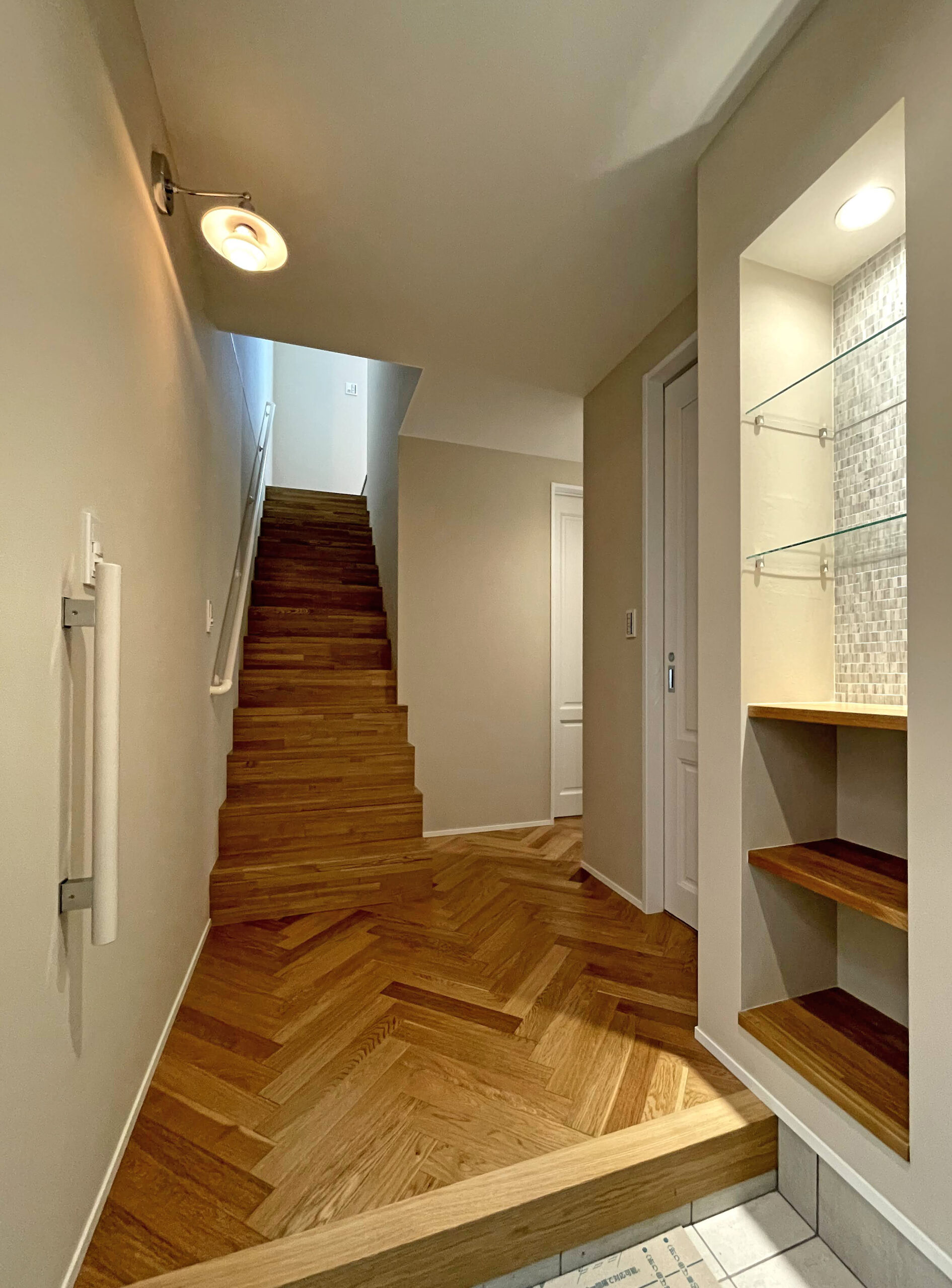 玄関ホールには無垢材のへりーんボーン床を採用しました。