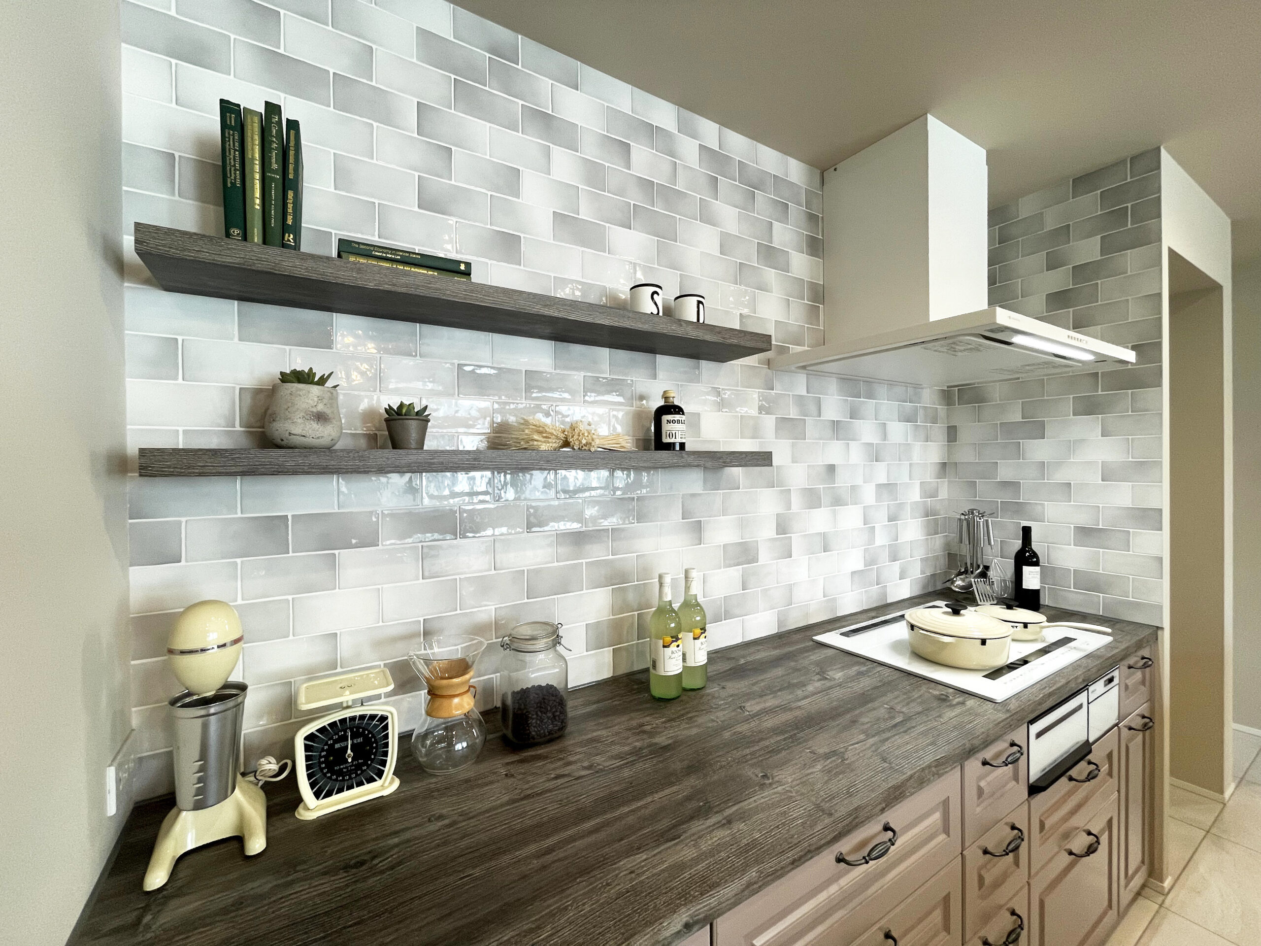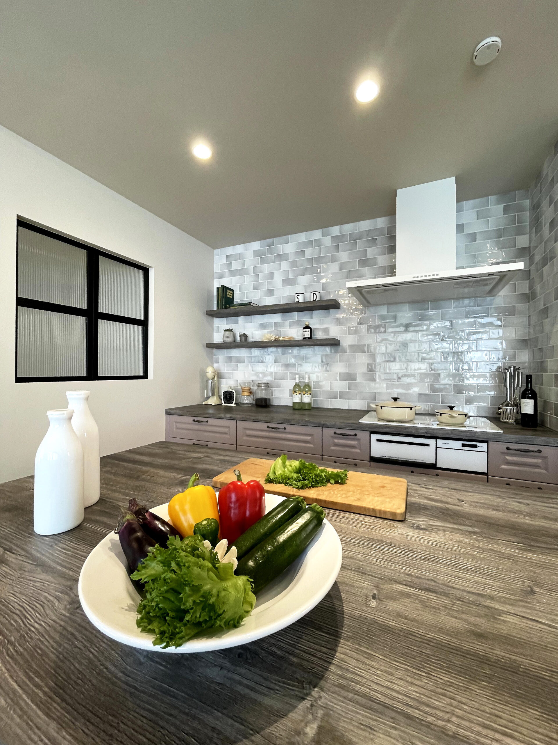 キッチンハウスのローズグレー色が映えるLDK空間に!