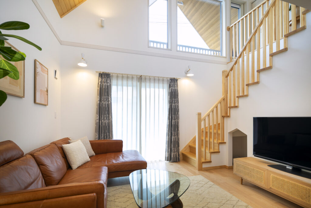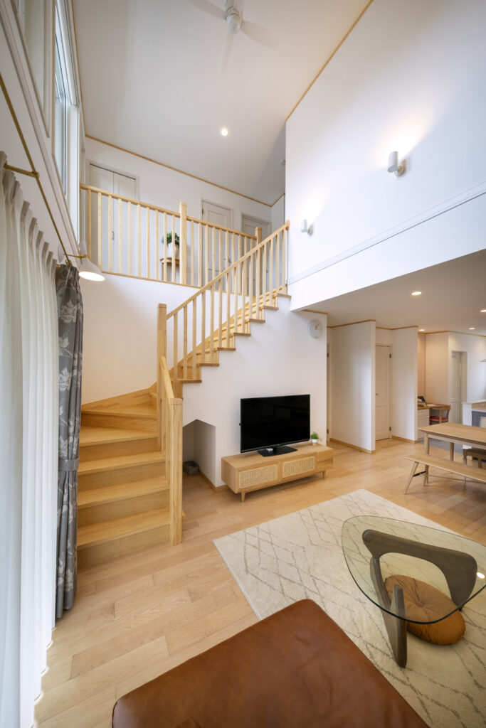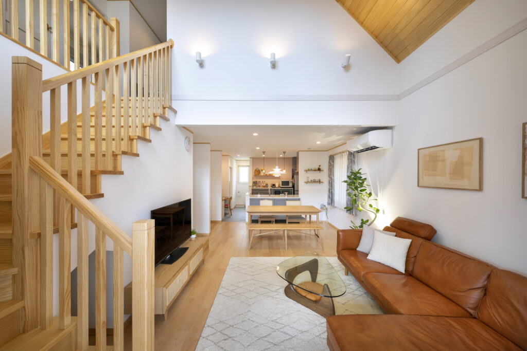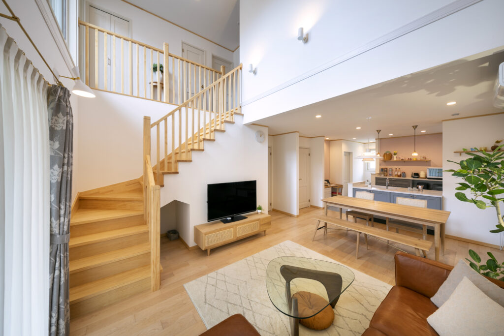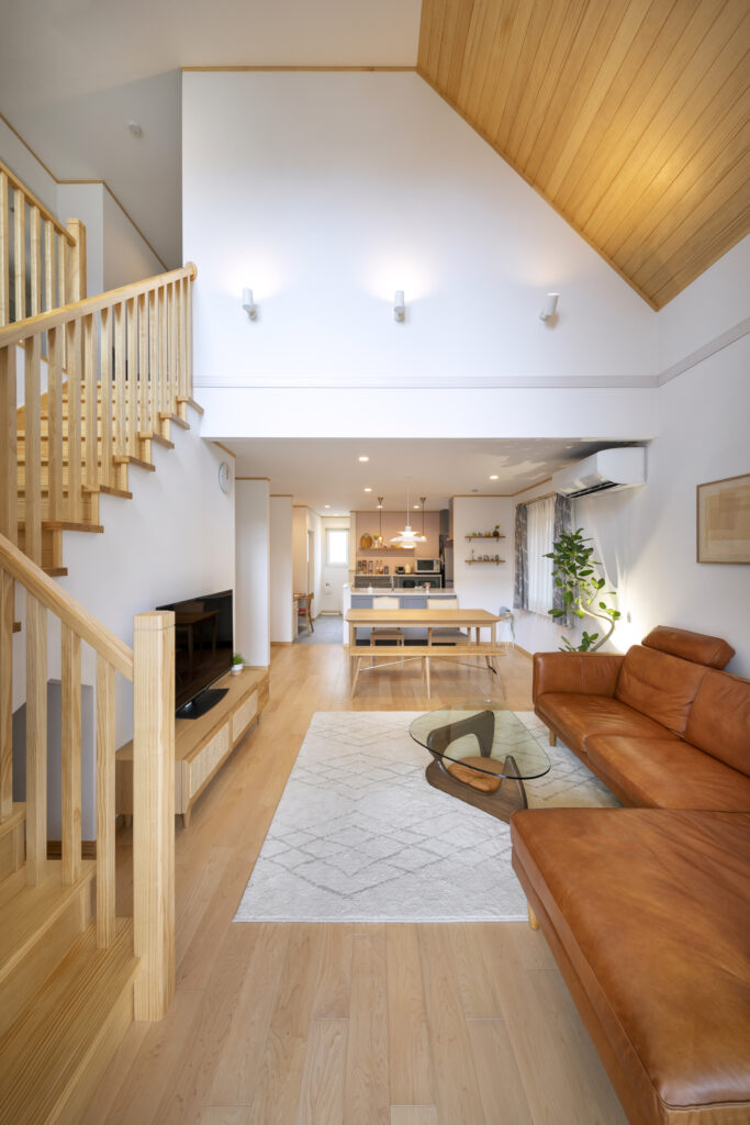 傾斜天井のLD、デュエスタイルのキッチンのある2階LDKの暮らし