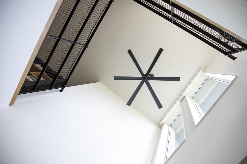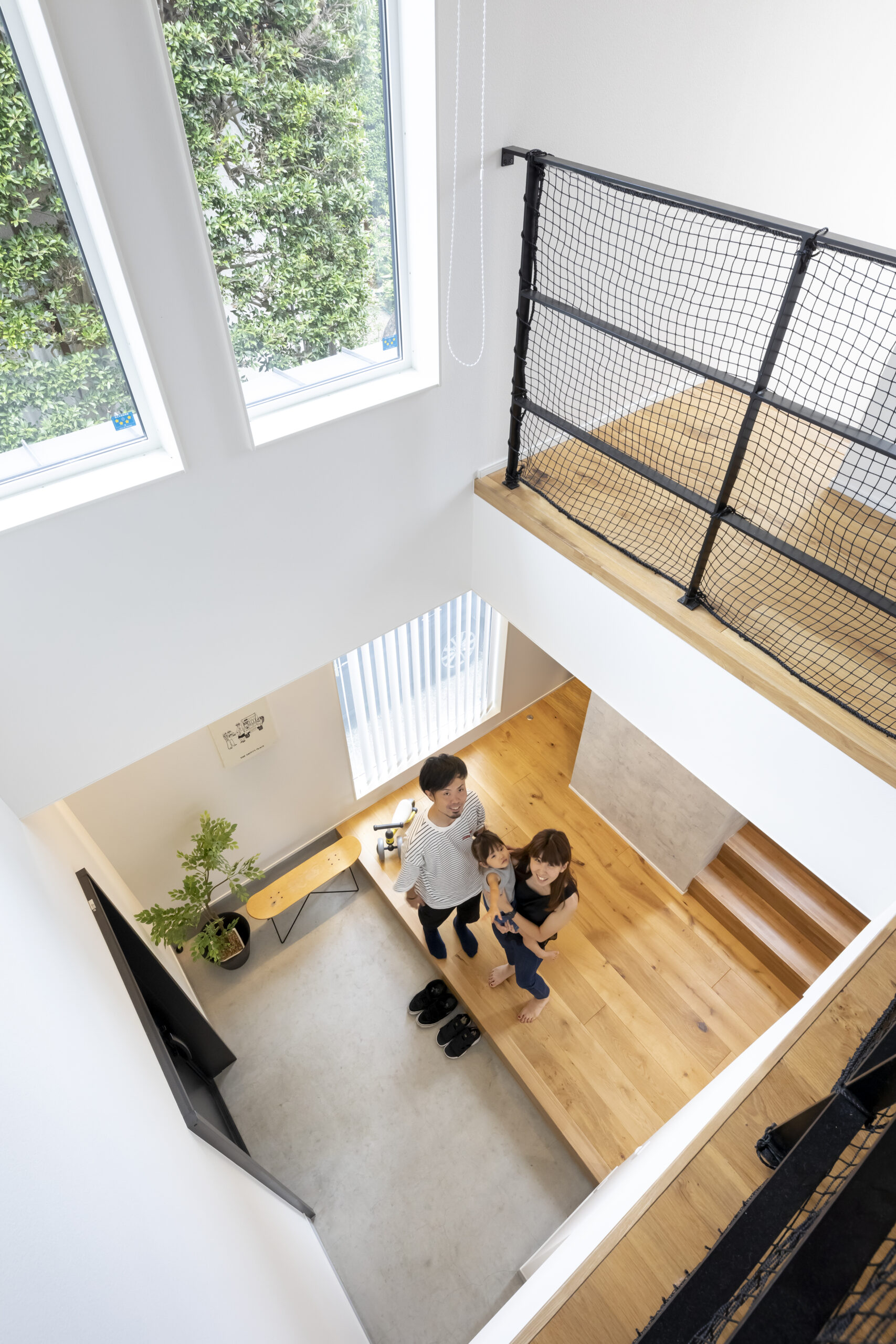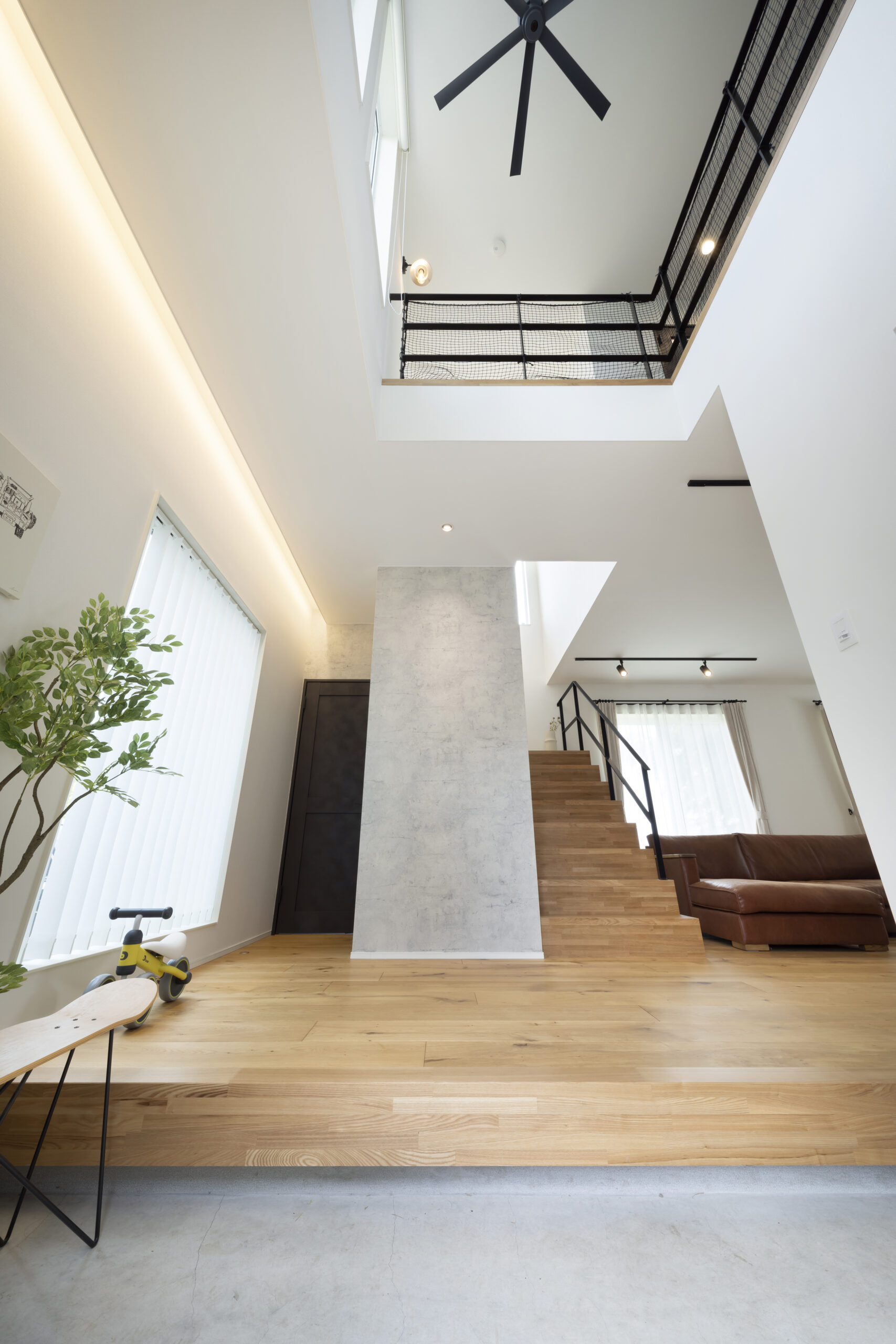 吹き抜けとヘリンボーン床が美しい、光溢れる開放的なリビングの住まい