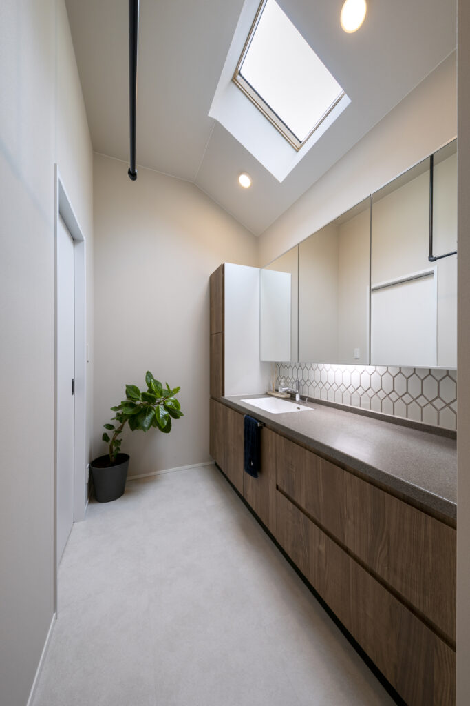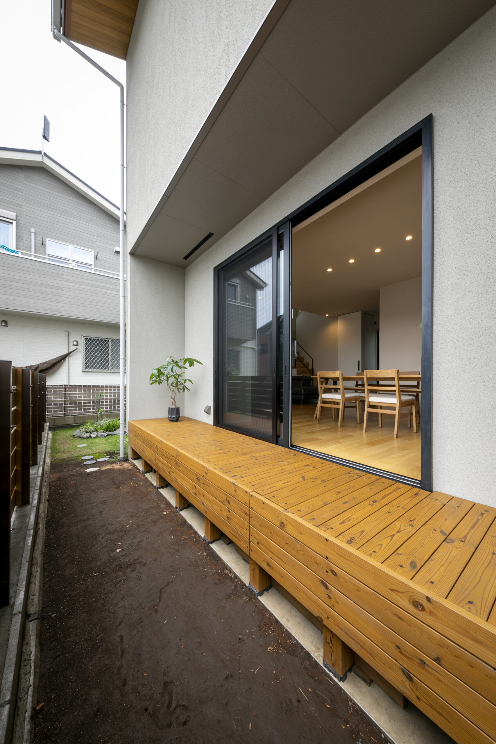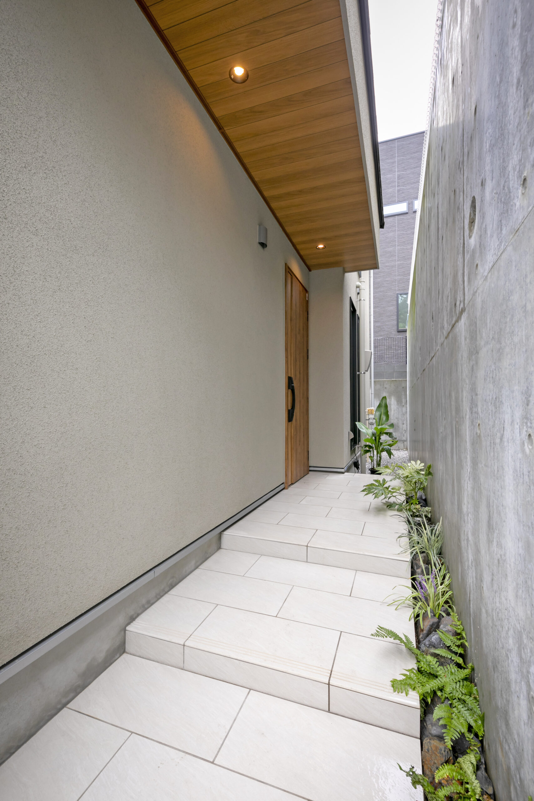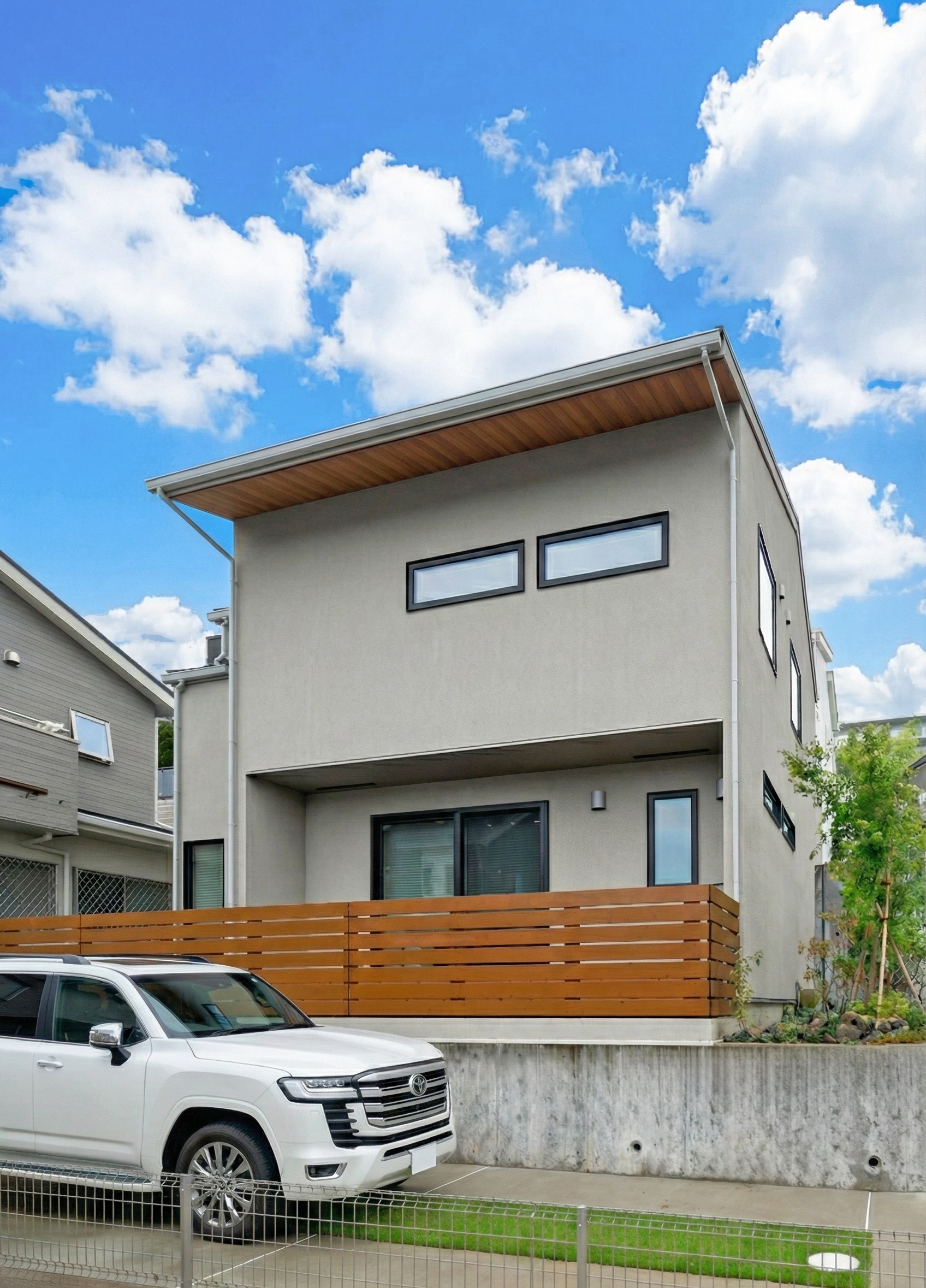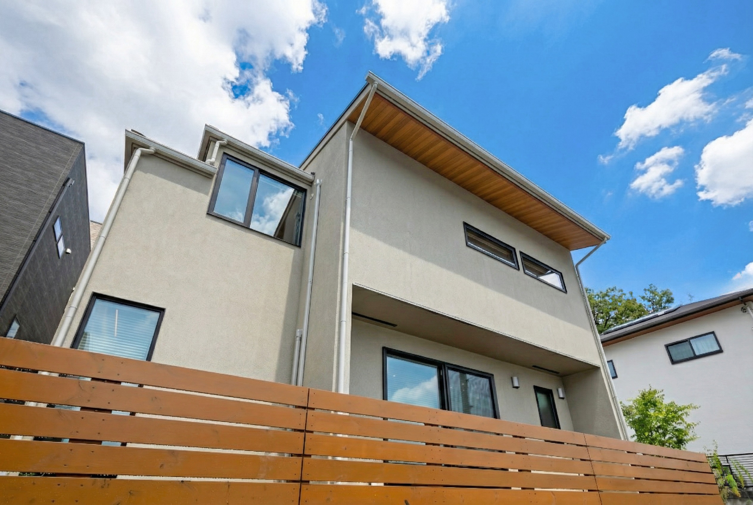 木目の軒天とグレーの塗り壁が織りなすシンプルモダンの暮らし