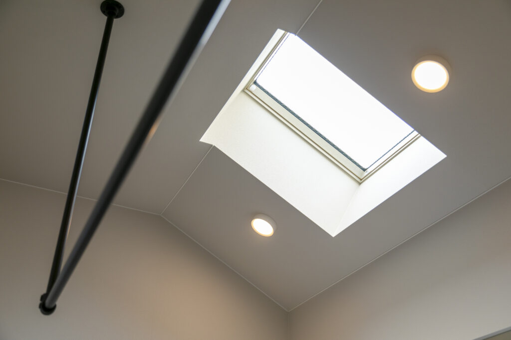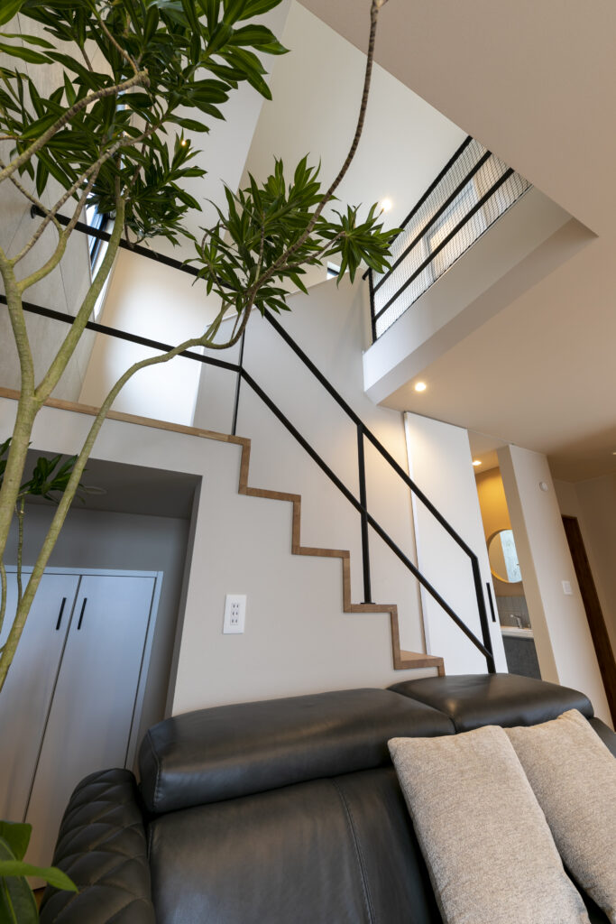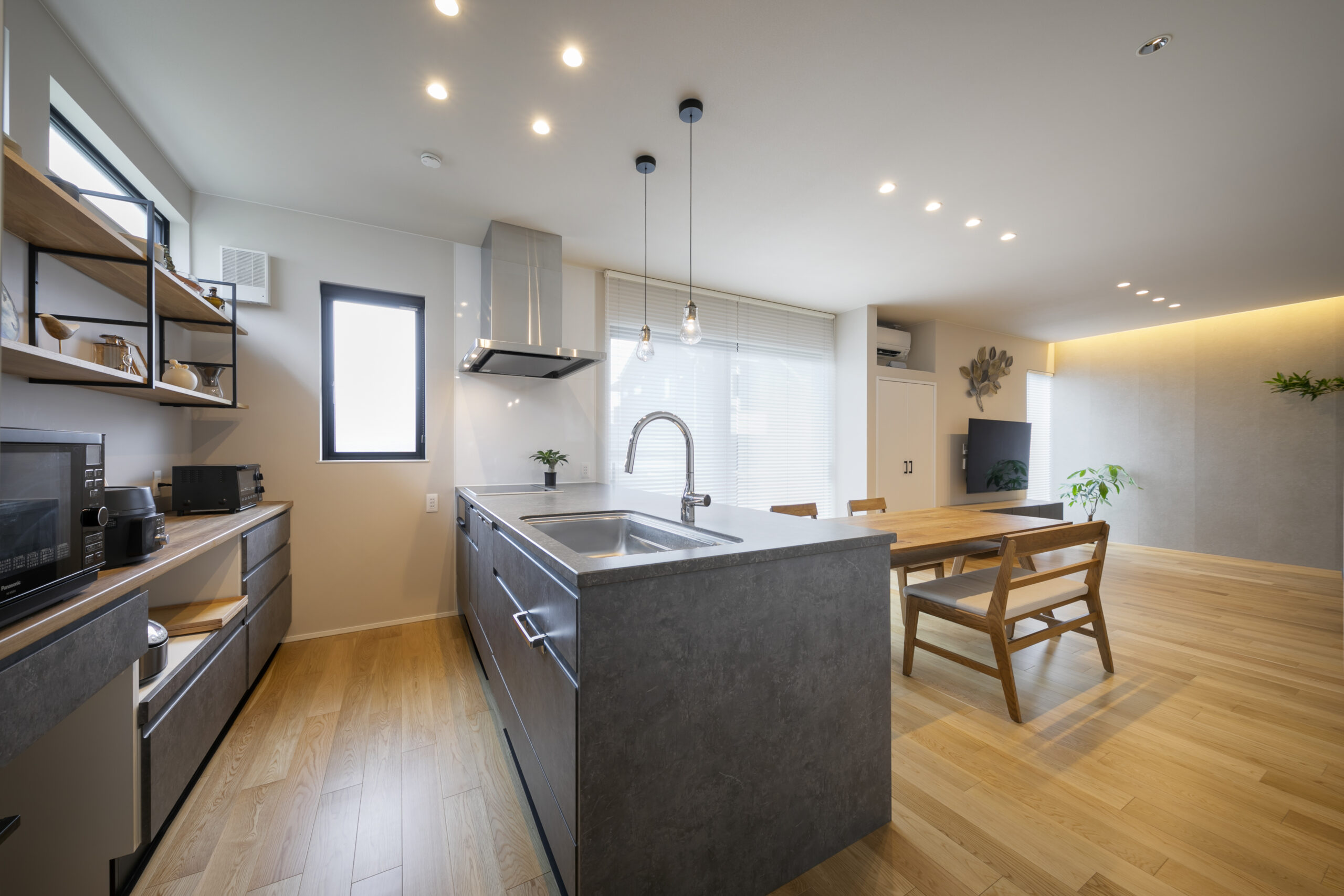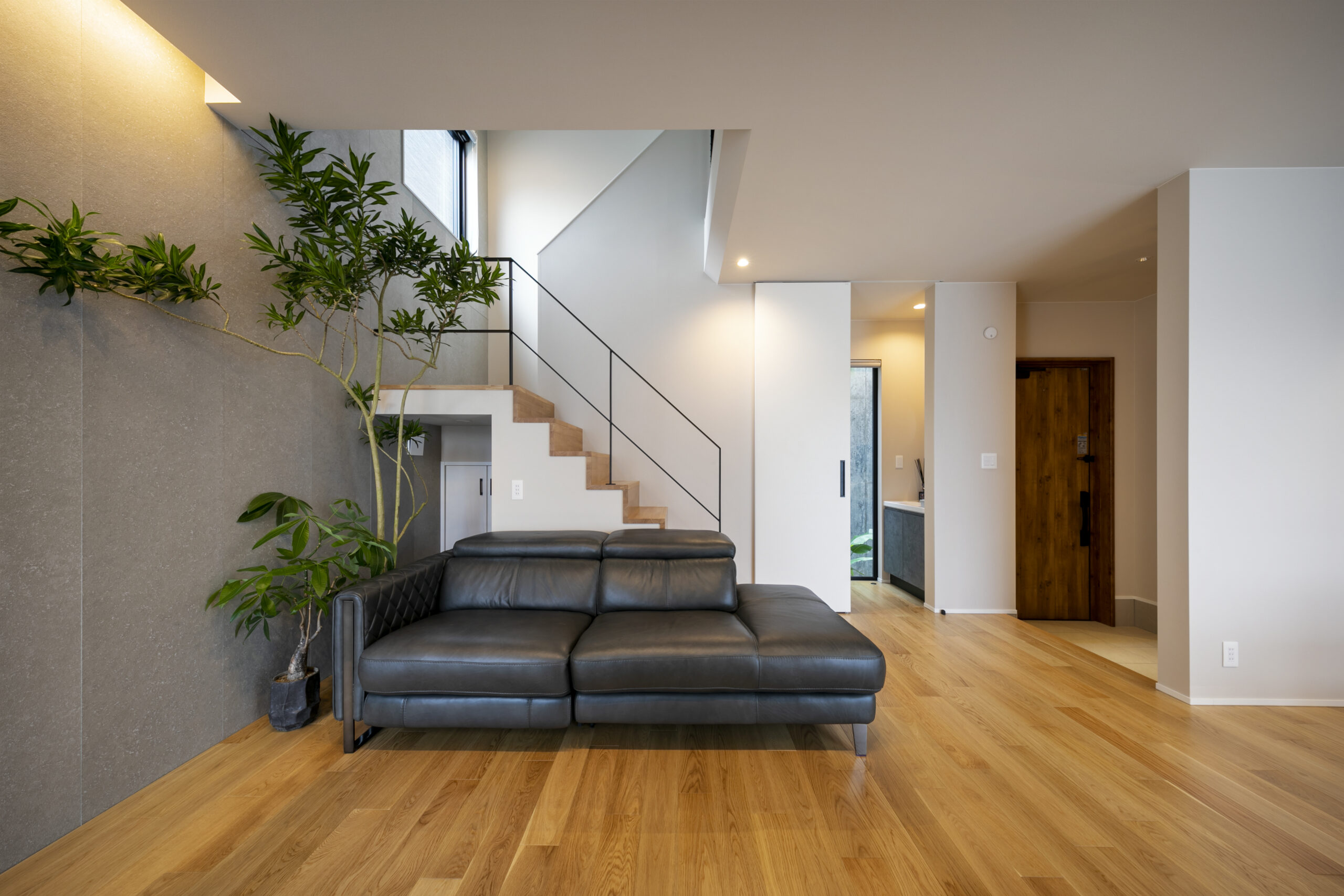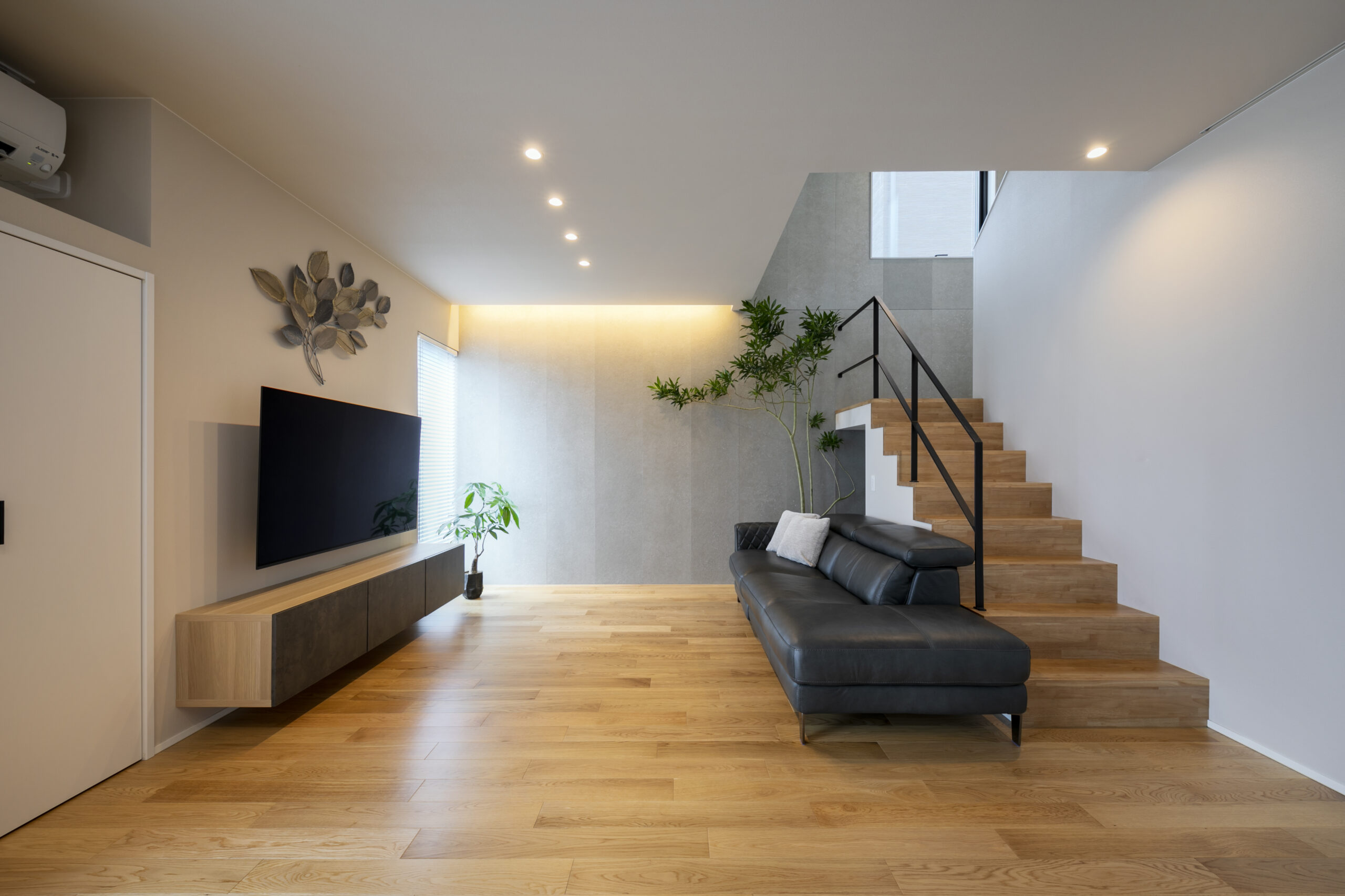 木目の軒天とグレーの塗り壁が織りなすシンプルモダンの暮らし