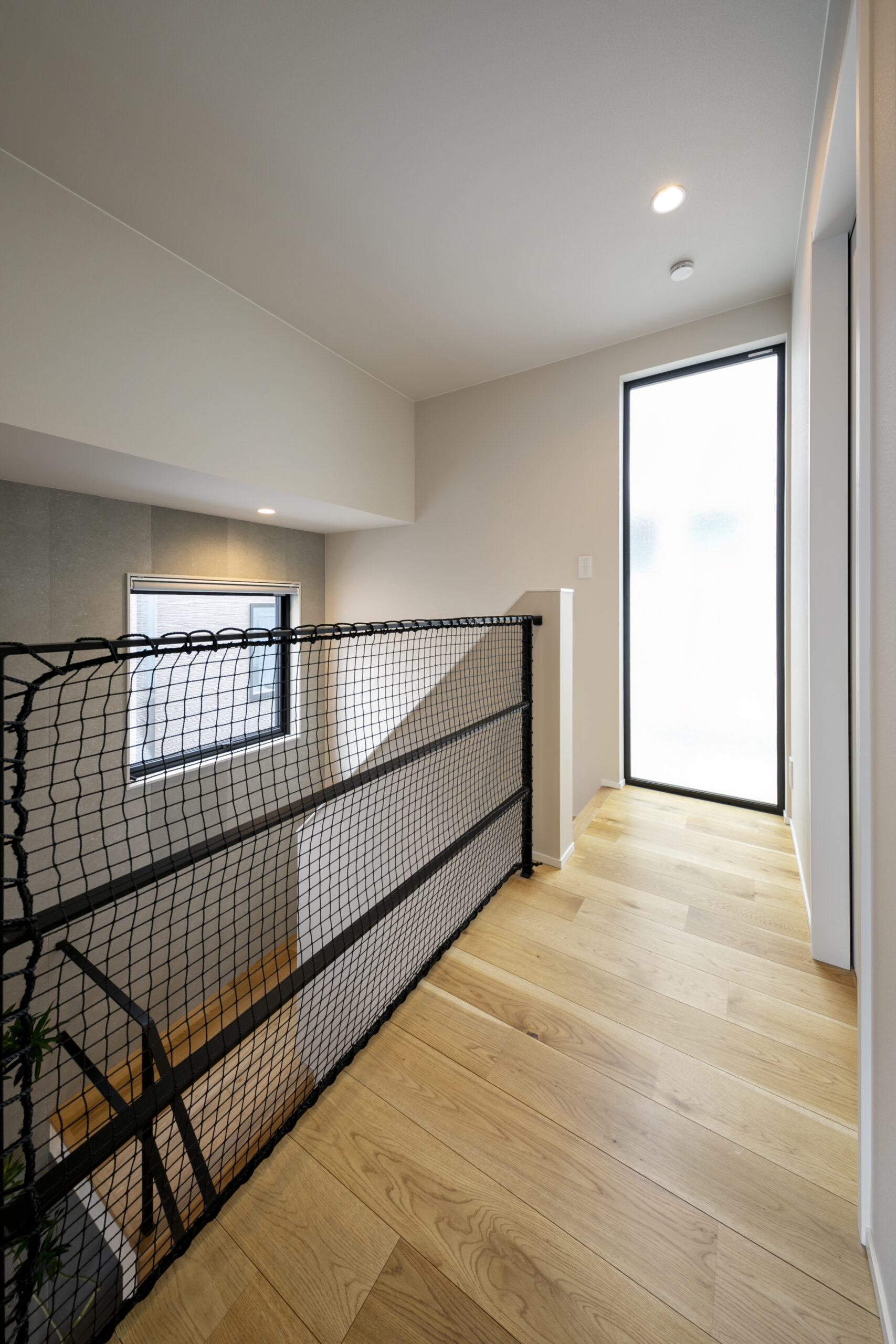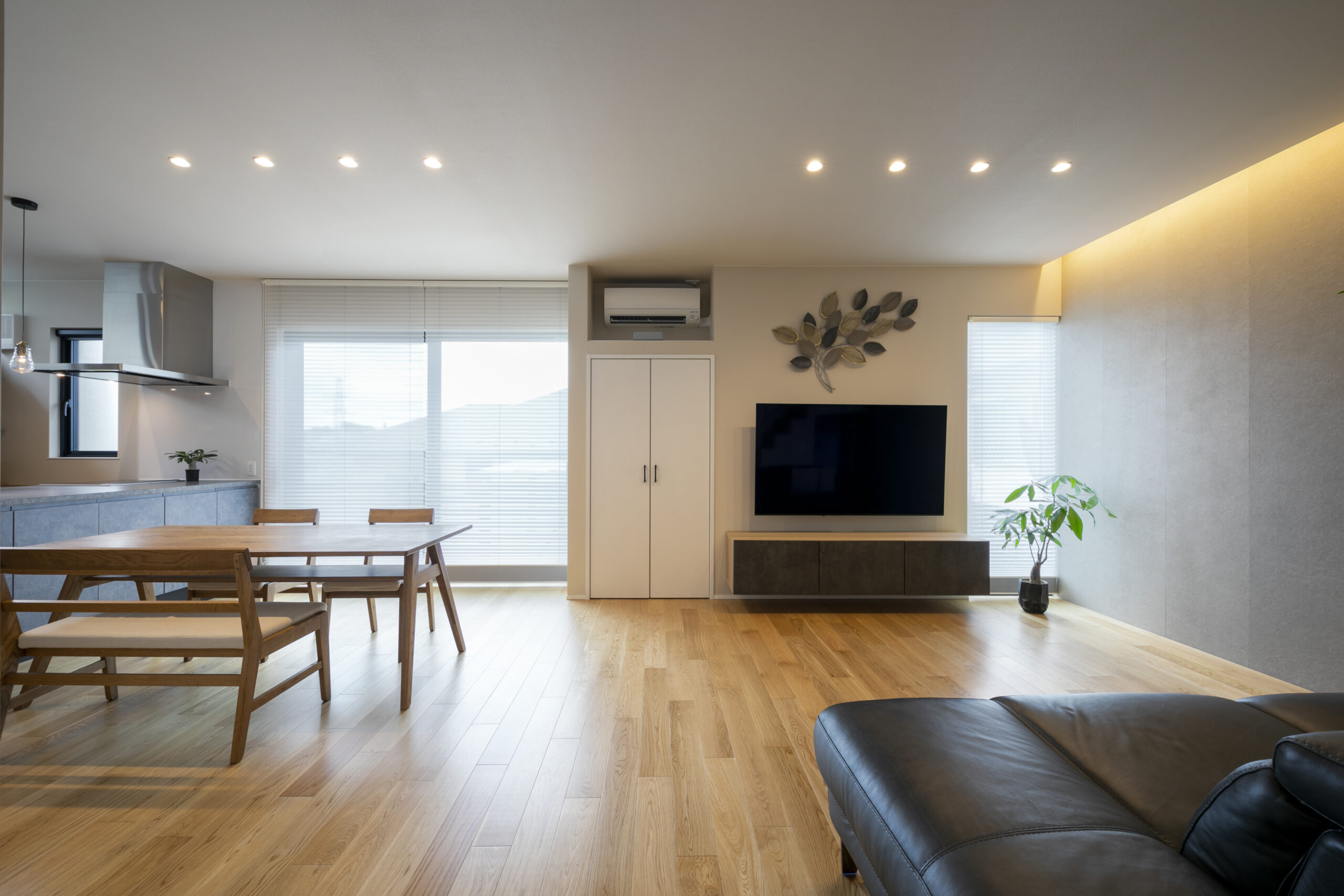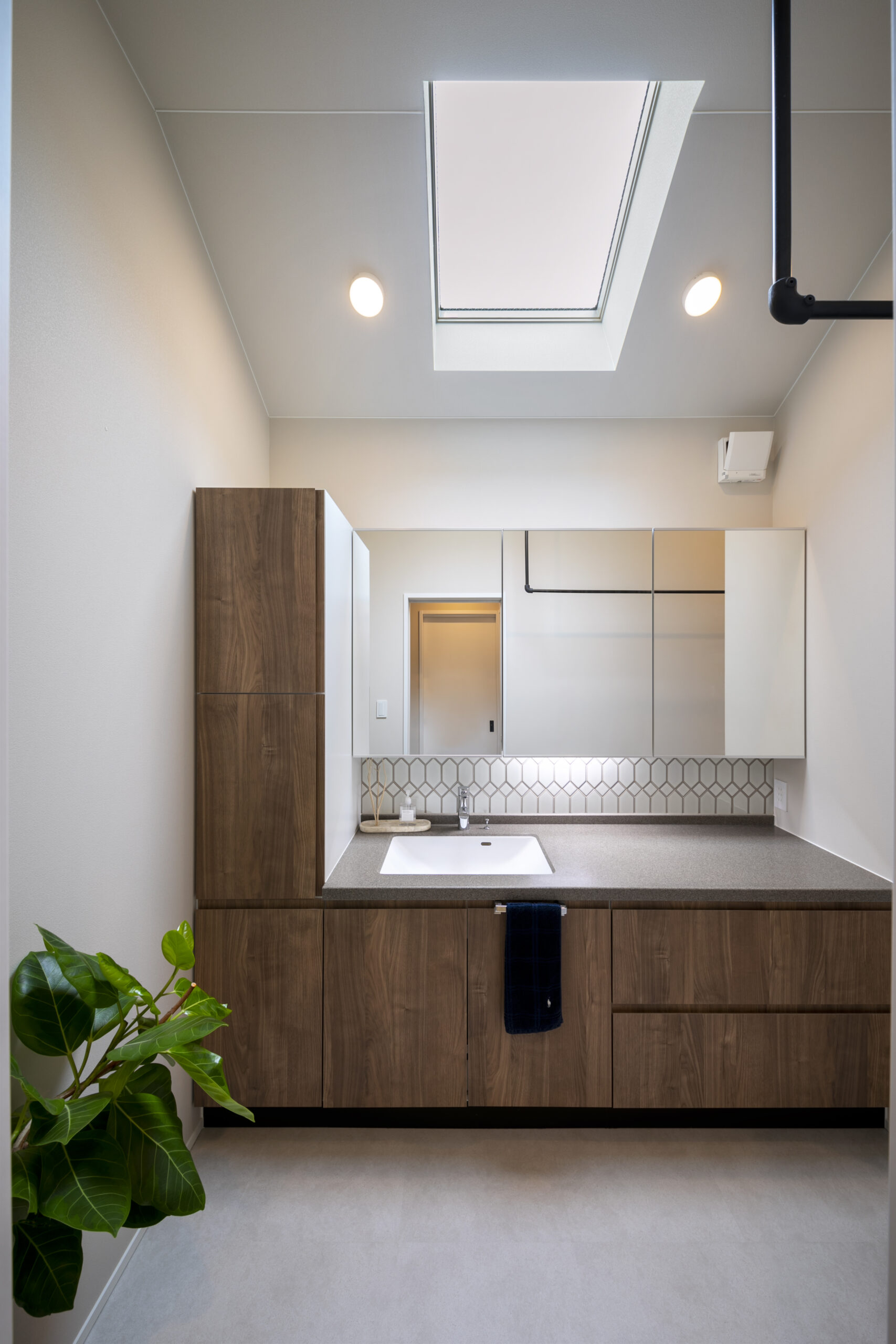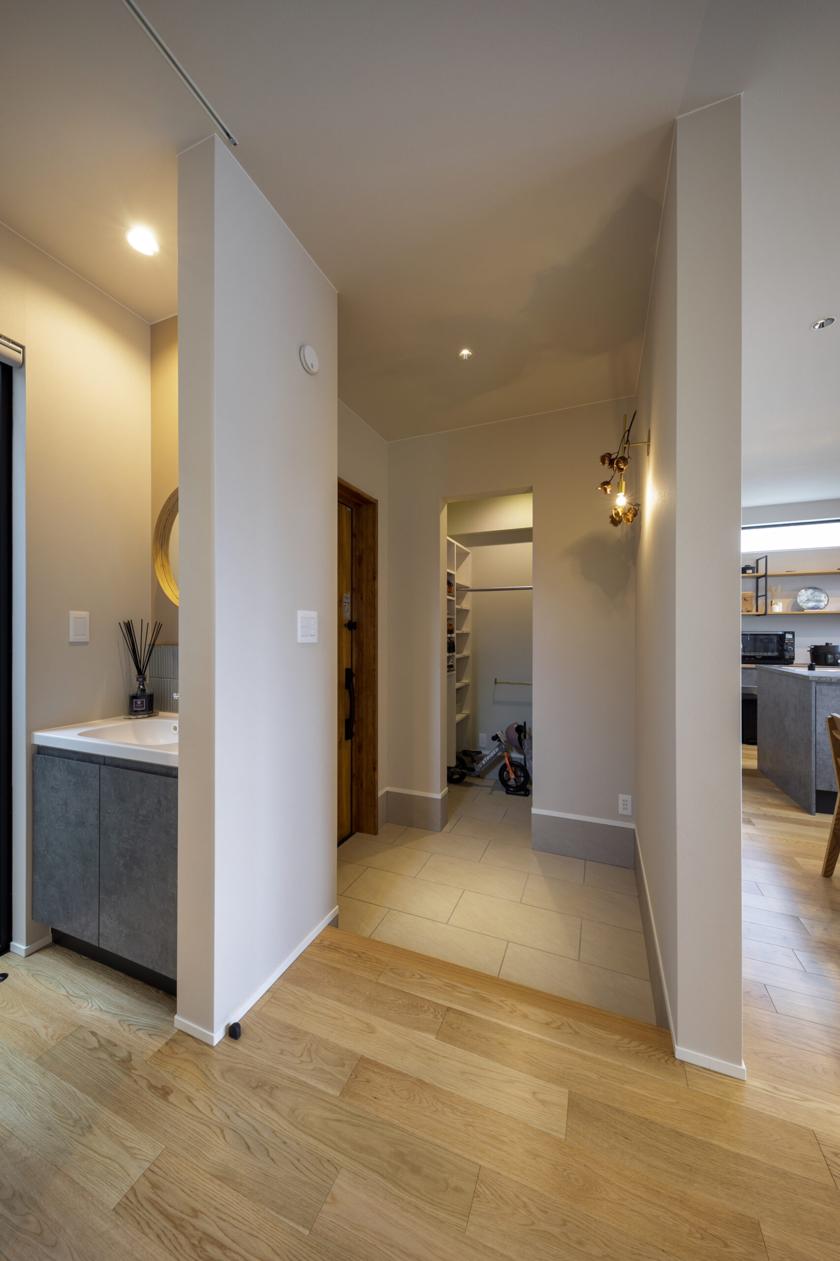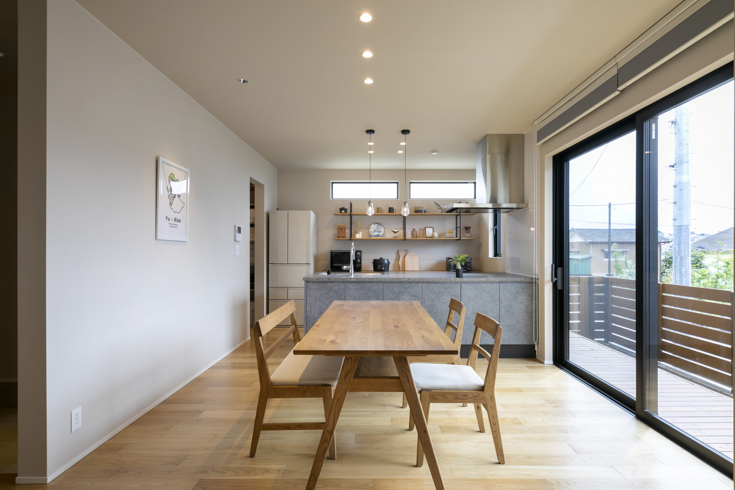 木目の軒天とグレーの塗り壁が織りなすシンプルモダンの暮らし