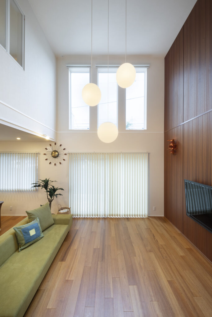 吹き抜けとフラットバー手摺のあるリビングのある暮らし