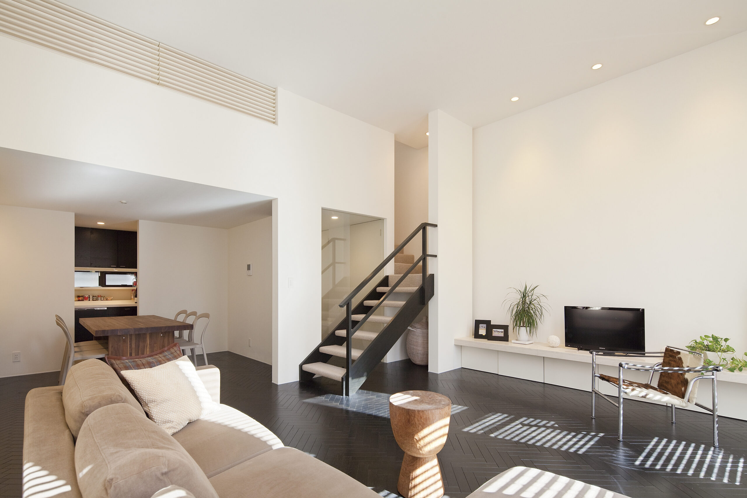 吹き抜けとヘリンボーン床が美しい、光溢れる開放的なリビングの住まい