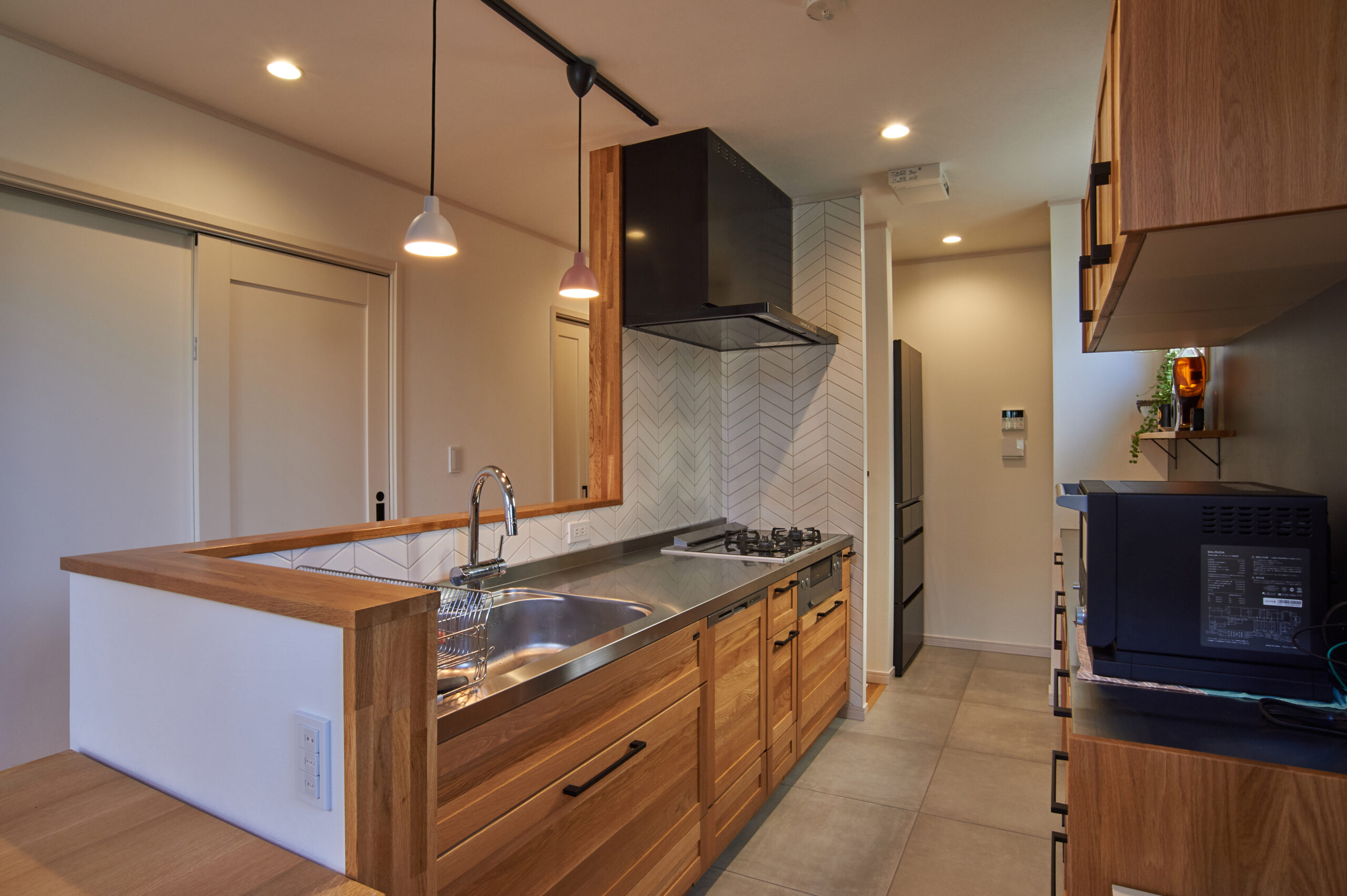 鉄骨階段×全面タイル床×キッチンハウス×モノトーンの暮らし