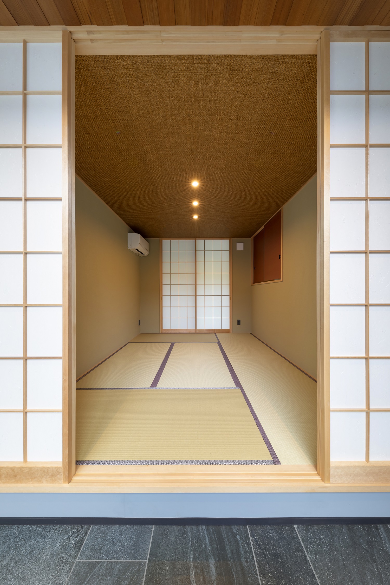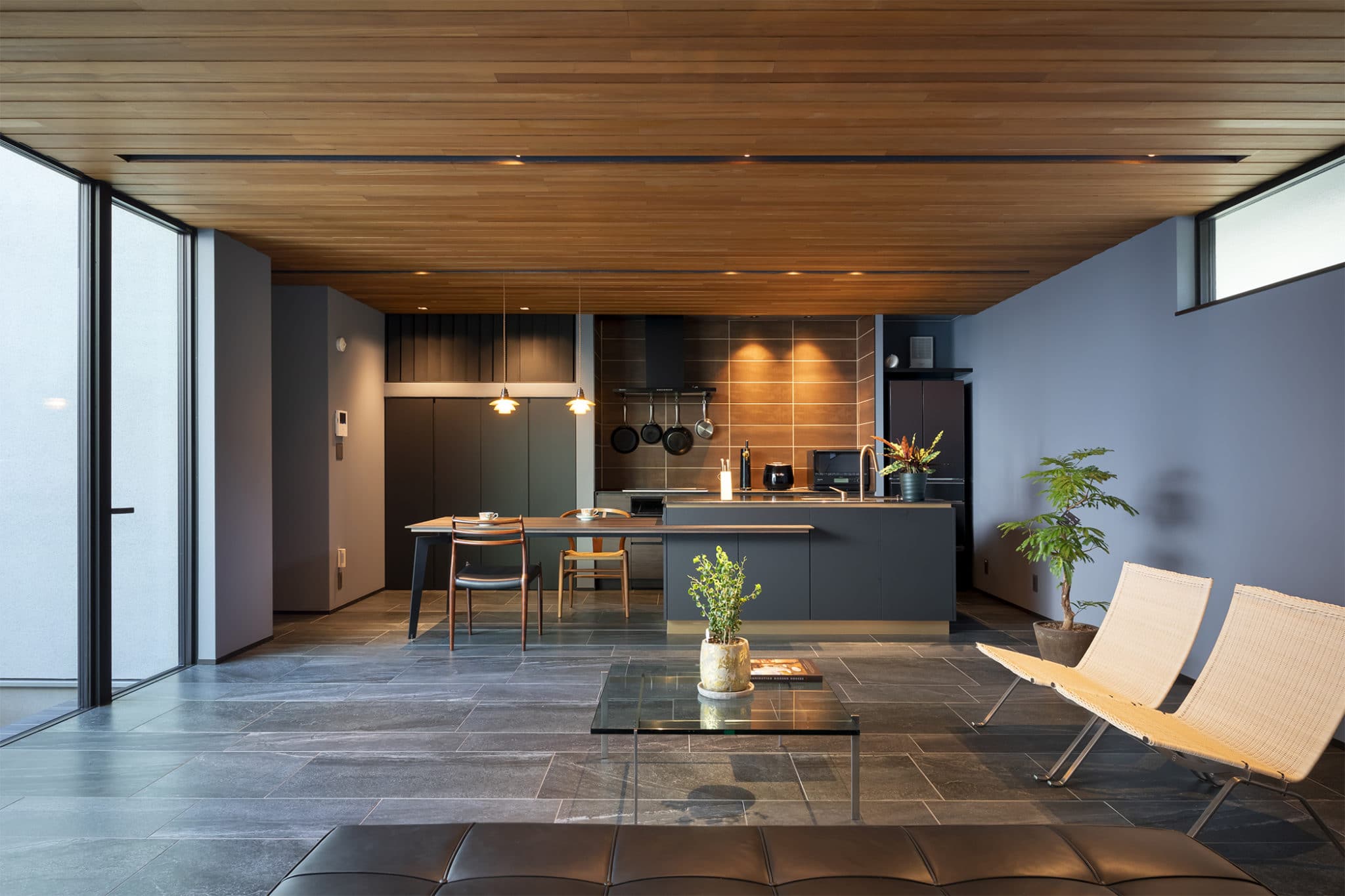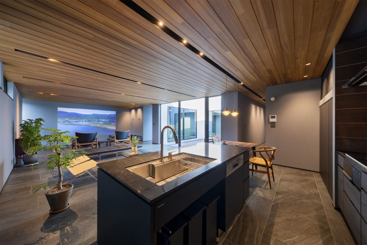玄関を入ると中庭の風情に迎えられ、広々としたリビングへと導かれる。キッチンから浴室→ランドリールーム→WIC→主寝室へと繋がる快適動線。小屋裏と適所に設けられた収納によって、常に整然とした空間に保たれる。