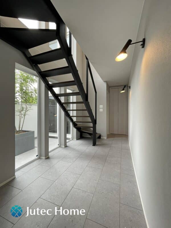 また、2階フロア全面には見た目とメンテナンス性にも優れた磁器タイルの床を採用し、更にJUTECオリジナルの「蓄熱式温水床暖房」も設置。しっとり上質の時間に満たされる北欧テイスト!