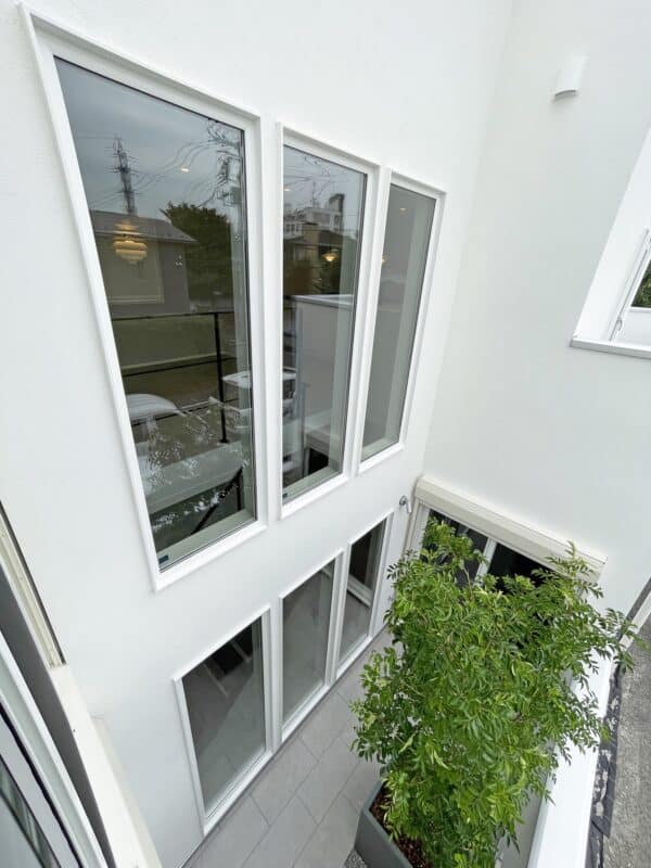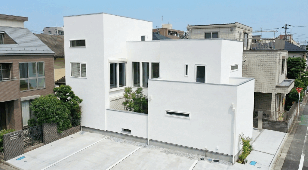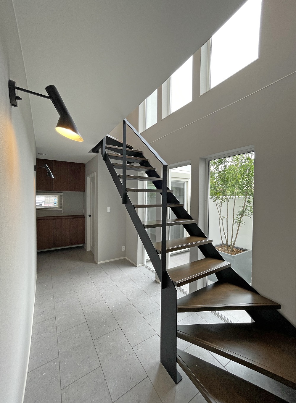 2階LDKを中心に中庭のある住まい。隣地との位置関係や周辺環境を考慮した「コの字型」をゾーニング。外壁には超撥水効果のある自己洗浄力を持った外壁材を採用(STO)。