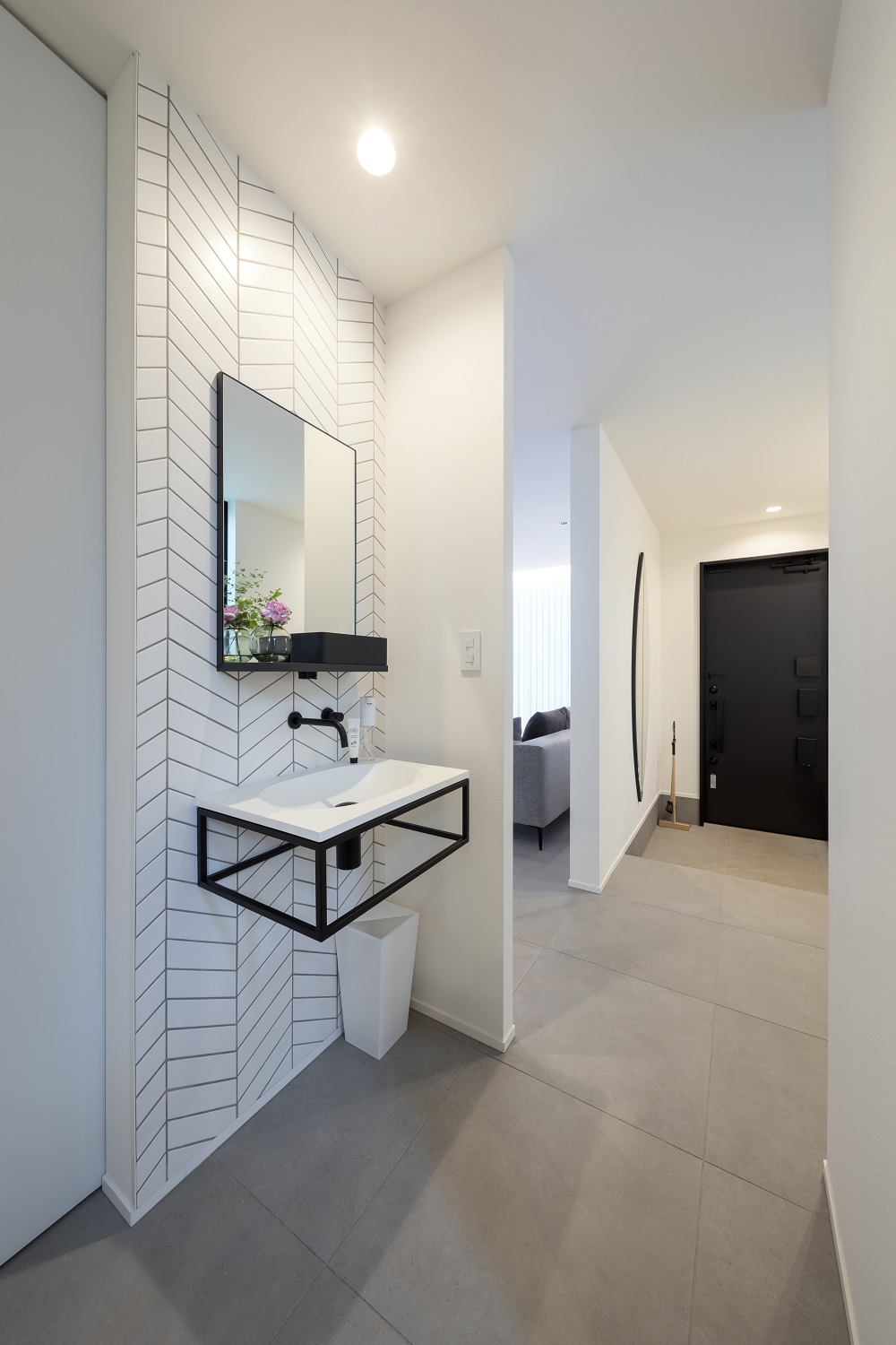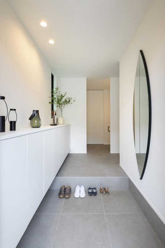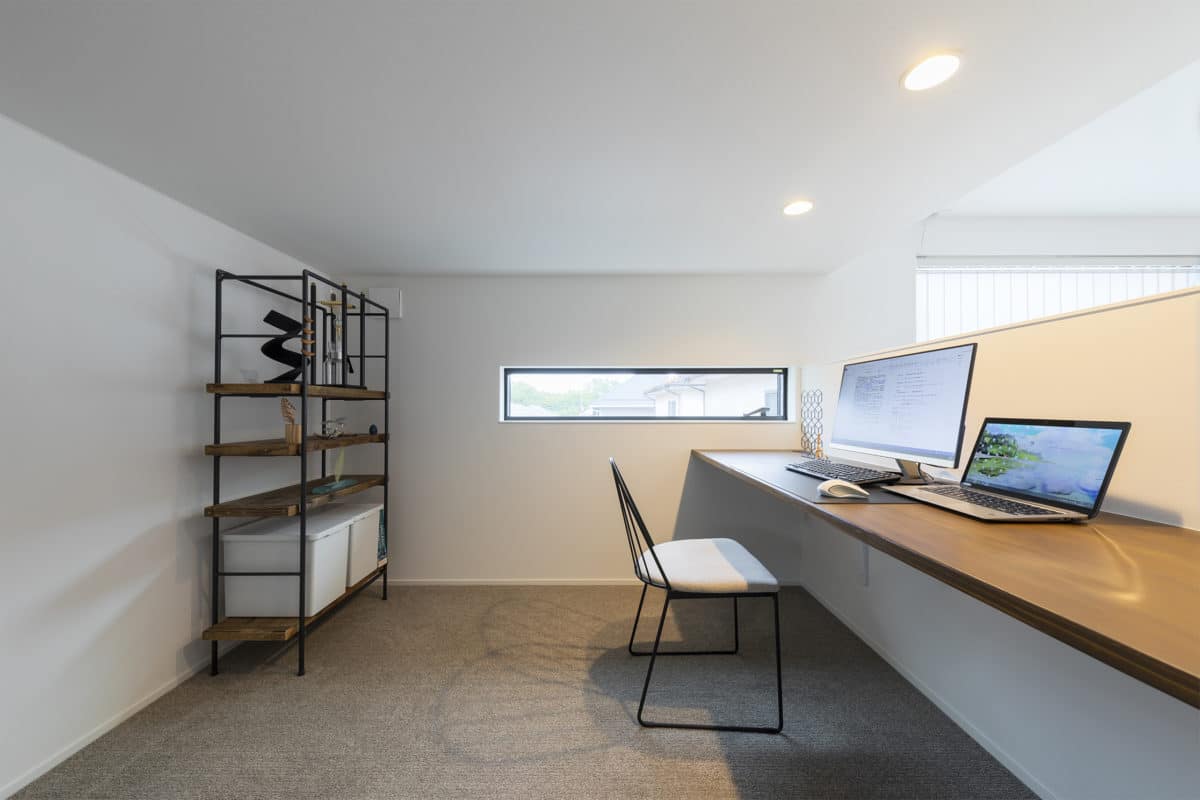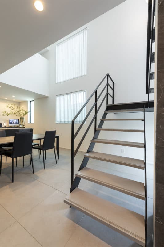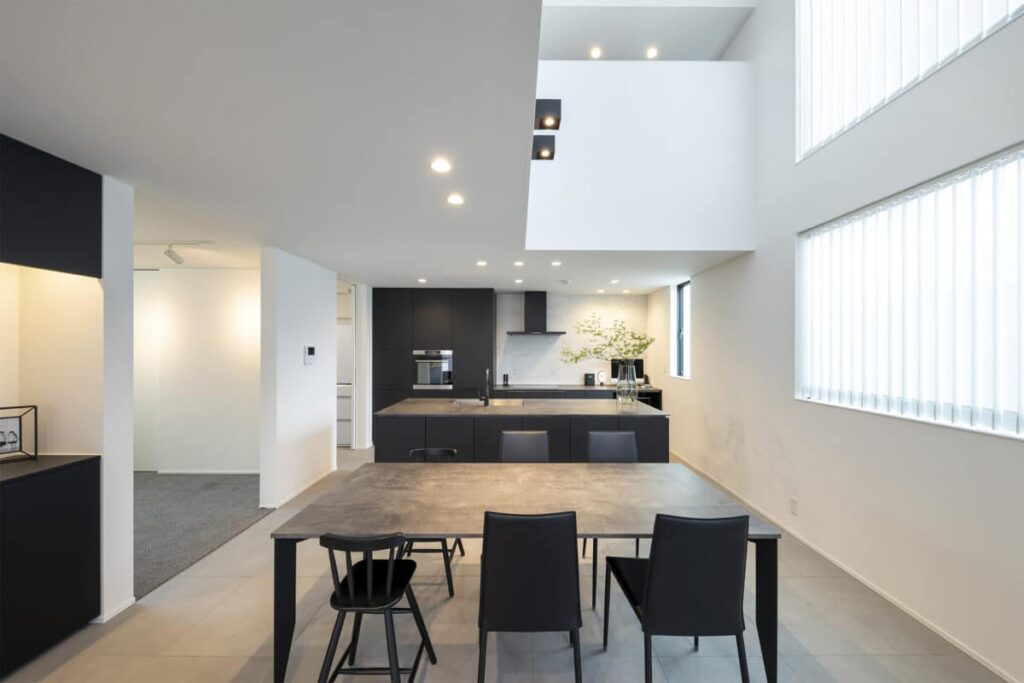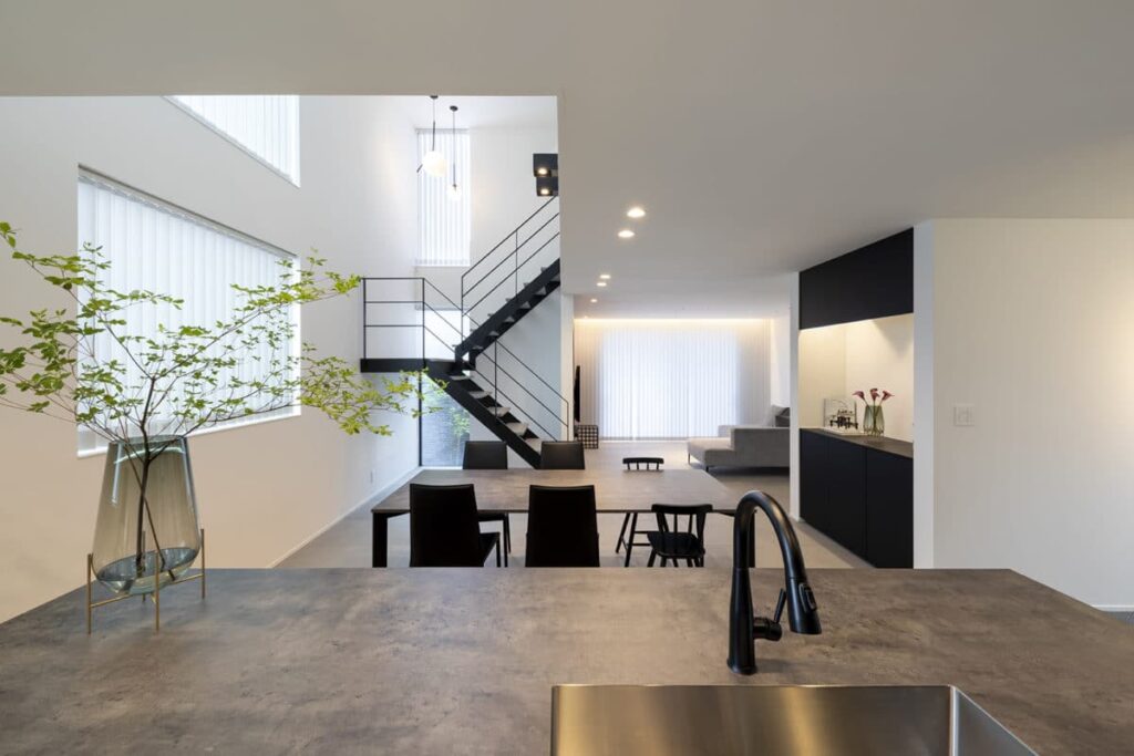 すっきりとした室内空間は、インテリアに造詣の深いご夫妻の想いを反映し、趣あるモノトーン空間に仕上げられた。キッチンを主役に、ランドリールーム、吹抜のスケルトン階段、書斎、小屋裏など、暮らしに寄り添う落ち着いた雰囲気で、インテリアがひときわ映える。