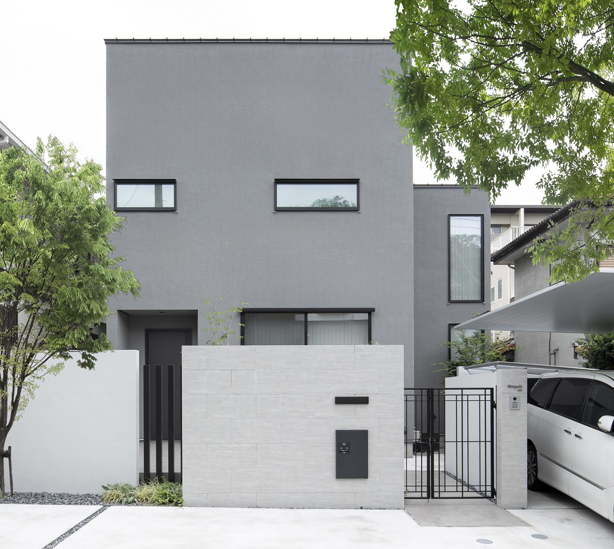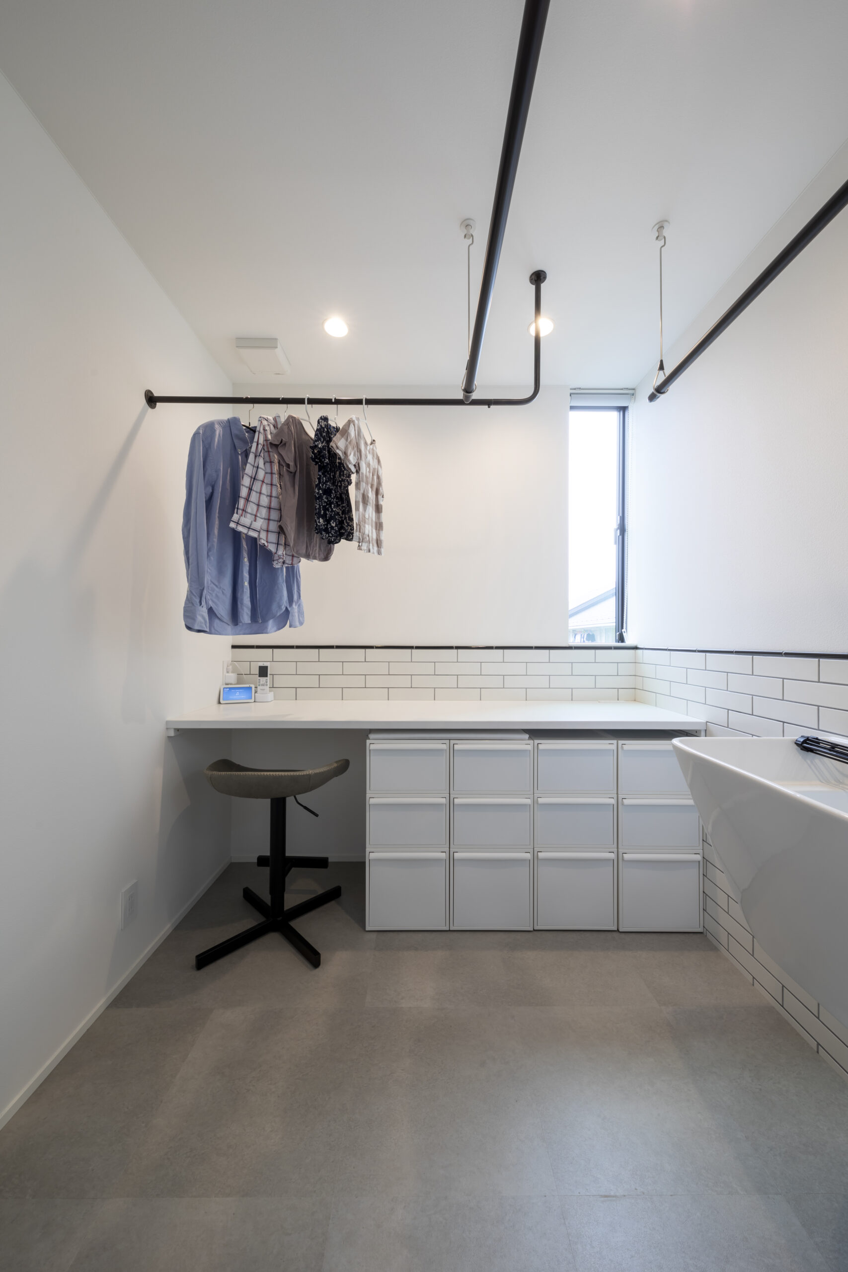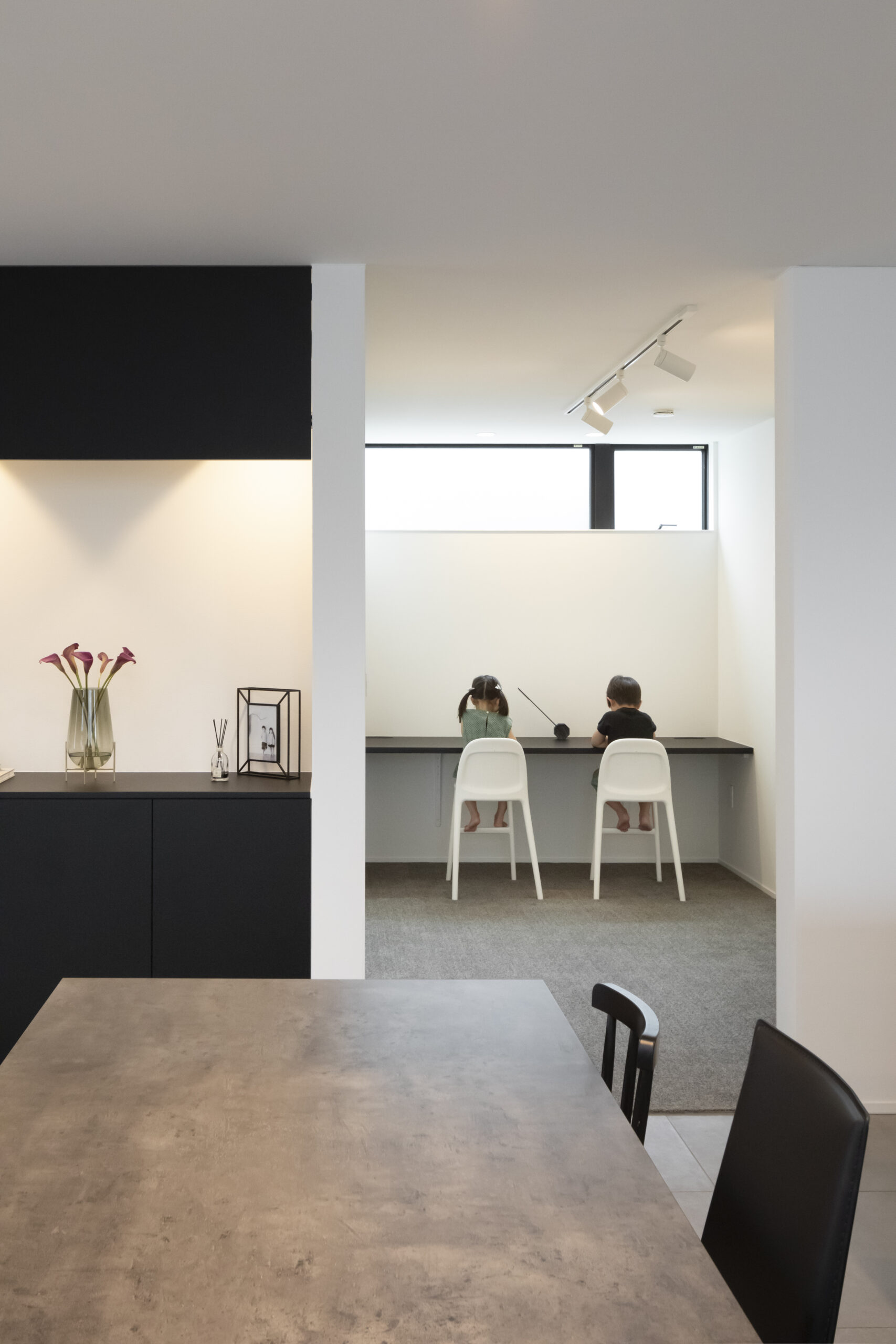 すっきりとした室内空間は、インテリアに造詣の深いご夫妻の想いを反映し、趣あるモノトーン空間に仕上げられた。キッチンを主役に、ランドリールーム、吹抜のスケルトン階段、書斎、小屋裏など、暮らしに寄り添う落ち着いた雰囲気で、インテリアがひときわ映える。