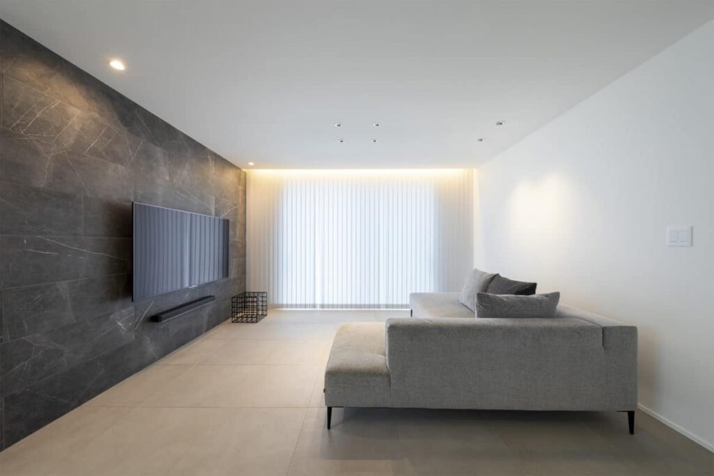 リビング全面タイル床×モノトーンの暮らし