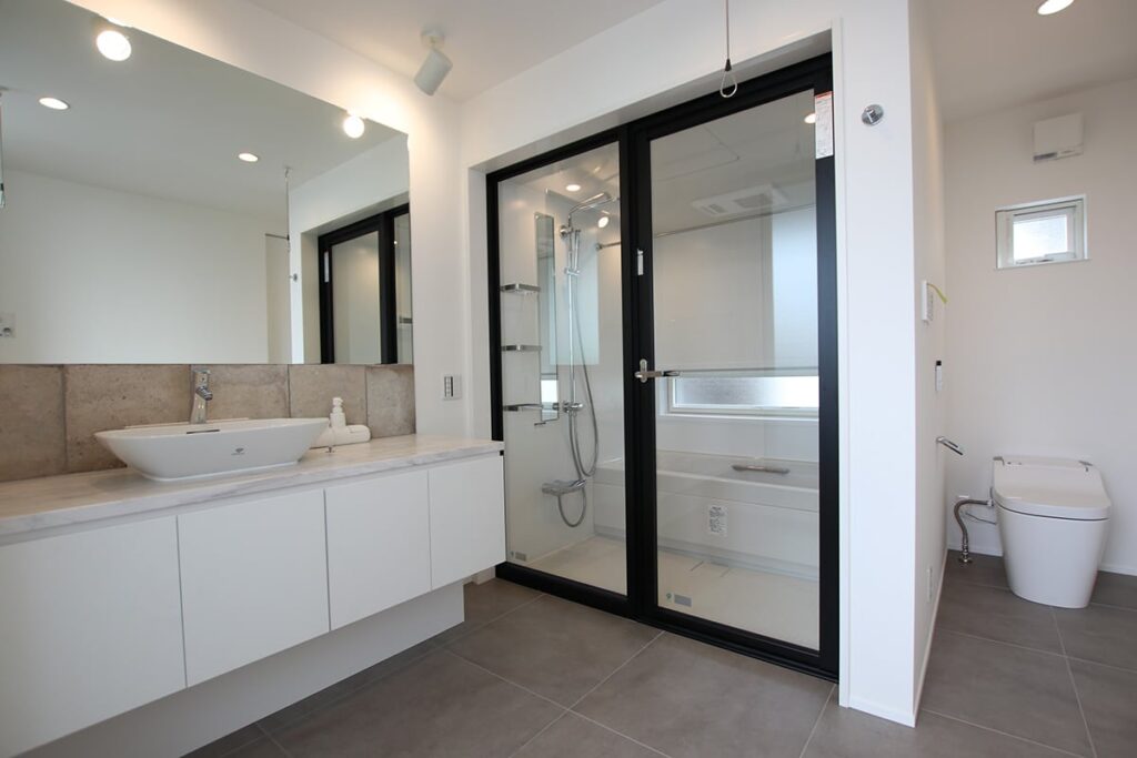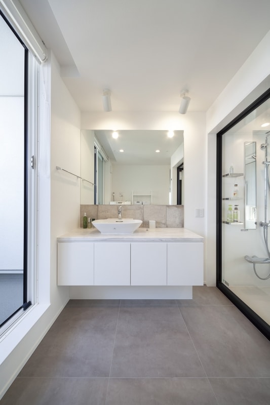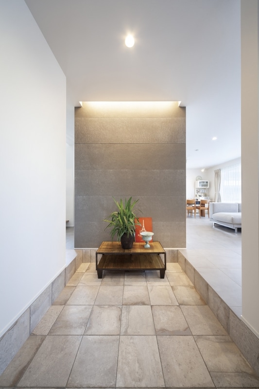 また、木質感を活かしたアイランドキッチンや内装と調和した造作の洗面化粧台、アクセントウォールを配した玄関ホール、天井に無垢材の羽目板をあしらったエントランスなど、全体がスッキリとしたデザインで調和された空間には、日常をより深めてくれる工夫が随所に散りばめられている。