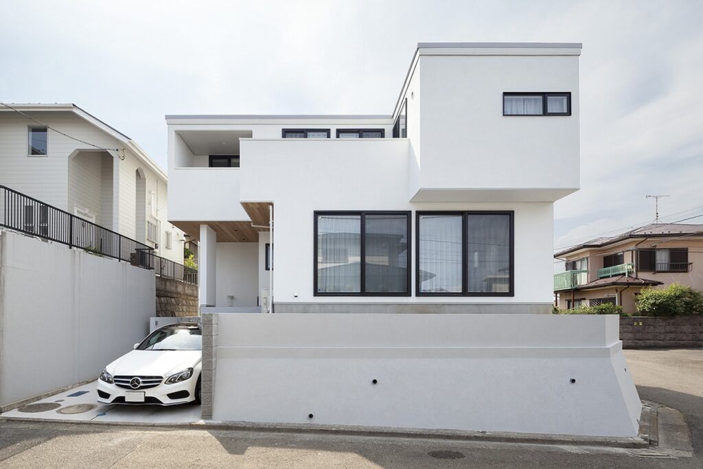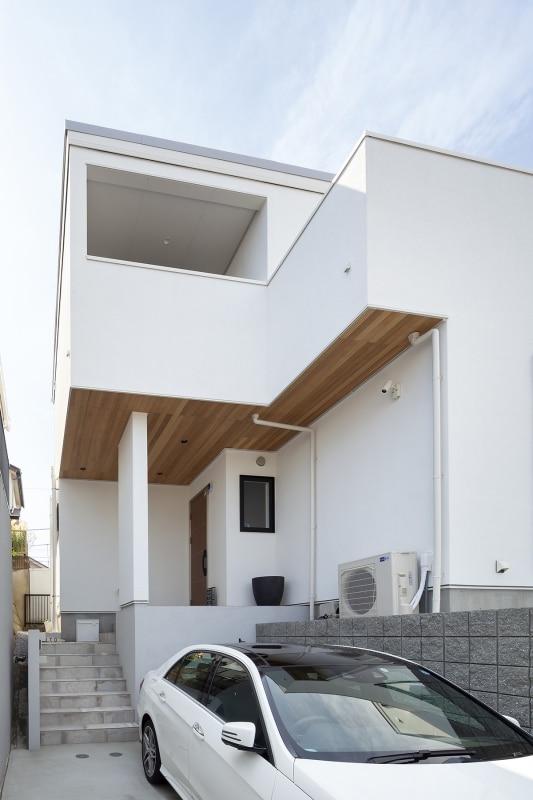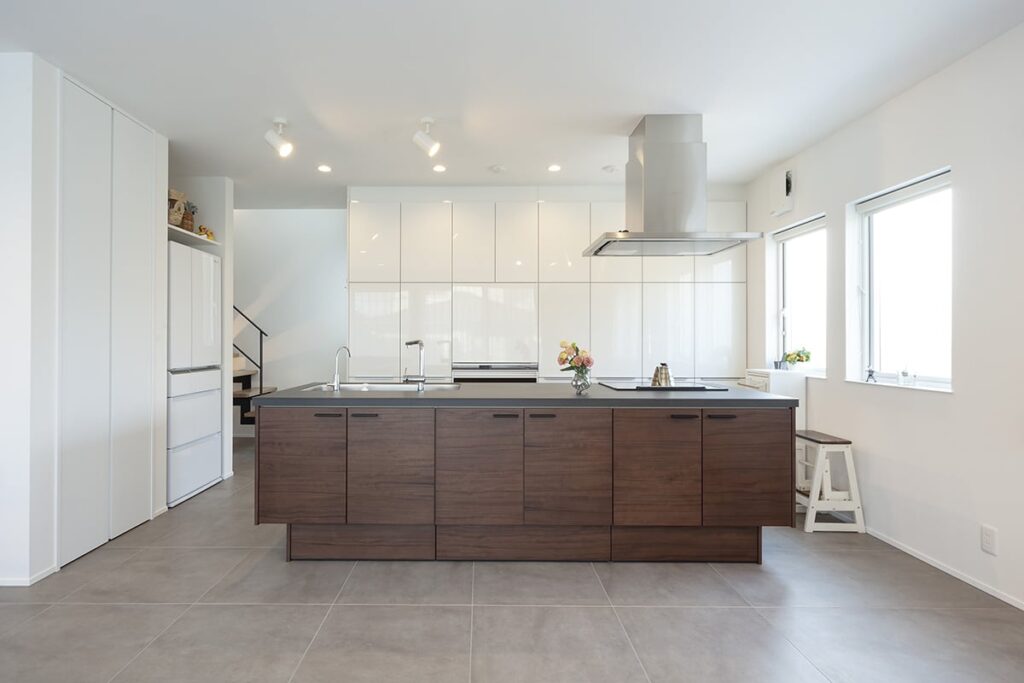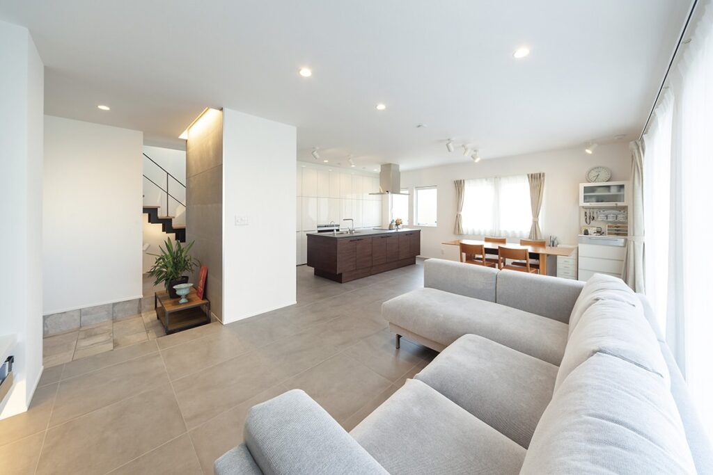 成人したお子さんと大人4人がスッキリと暮らすための空間を目指して住まいづくりがスタートした。外観も室内も白を基調に、シンプルかつスタイリッシュなデザインがIさんの暮らしを反映している。スケルトンの階段やタイルの床が落ち着いた上質感を醸し出し、キッチンの背面もで機能美を追及。
