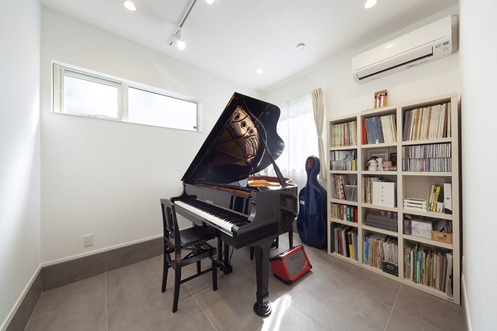 趣味の音楽を心ゆくまで楽しみたい──そんなIさんご家族の思いを叶えるために、1階に家族全員で演奏ができるピアノ室が設けられた。